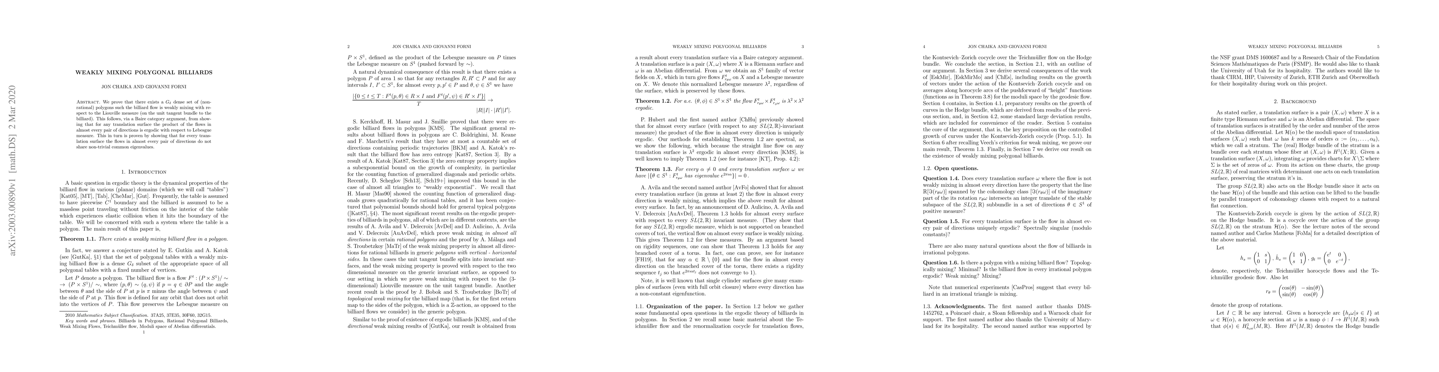 Summary: The paper establishes that a significant subset of non-rational polygons exhibit weakly mixing billiard flows relative to the Liouville measure, demonstrated through a Baire category argument and the ergodicity of almost every pair of directional flows on translation surfaces.