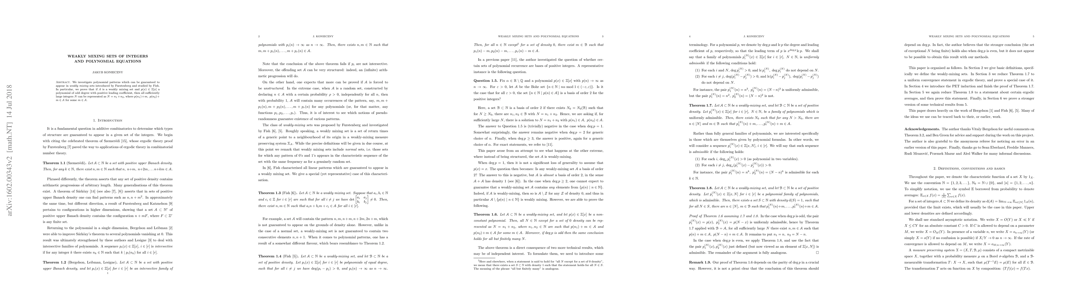 Summary: The paper proves that for any weakly mixing set \(A \subset \mathbb{N}\) and a polynomial \(p(x) \in \mathbb{Z}[x]\) of odd degree with a positive leading coefficient, there exist integers \(n_1, n_2 \in A\) and \(m \in A\) such that sufficiently large integers \(N\) can be expressed as \(N = p(n_1) + m = p(n_2) + m\).