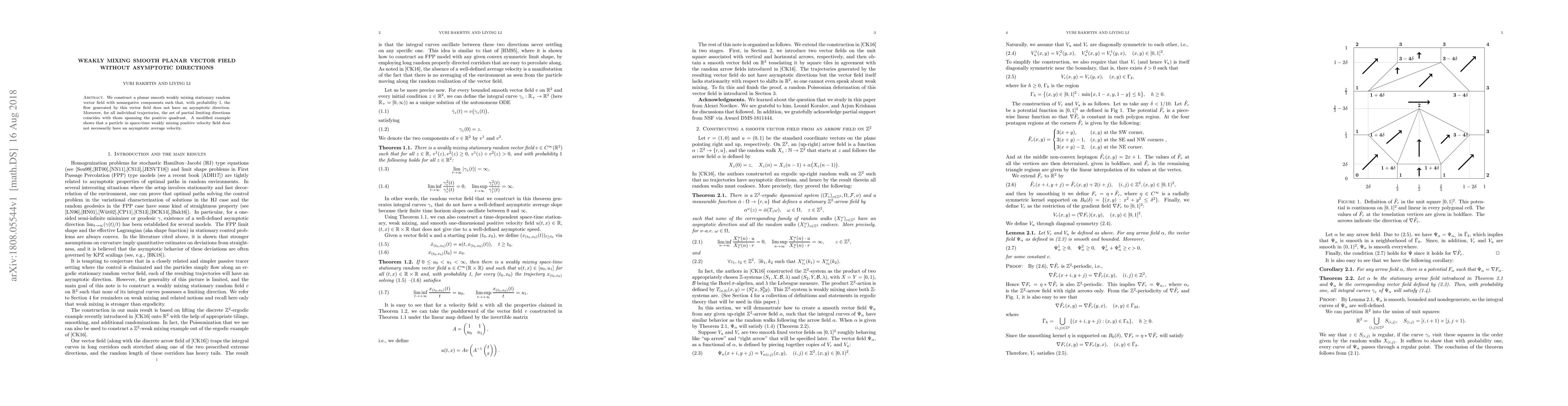 This paper constructs a smooth planar random vector field that exhibits weak mixing properties without having asymptotic directions, indicating that individual trajectories span the positive quadrant in their limiting directions. A modified example demonstrates that particles in a weakly mixing positive velocity field may not have an asymptotic average velocity.