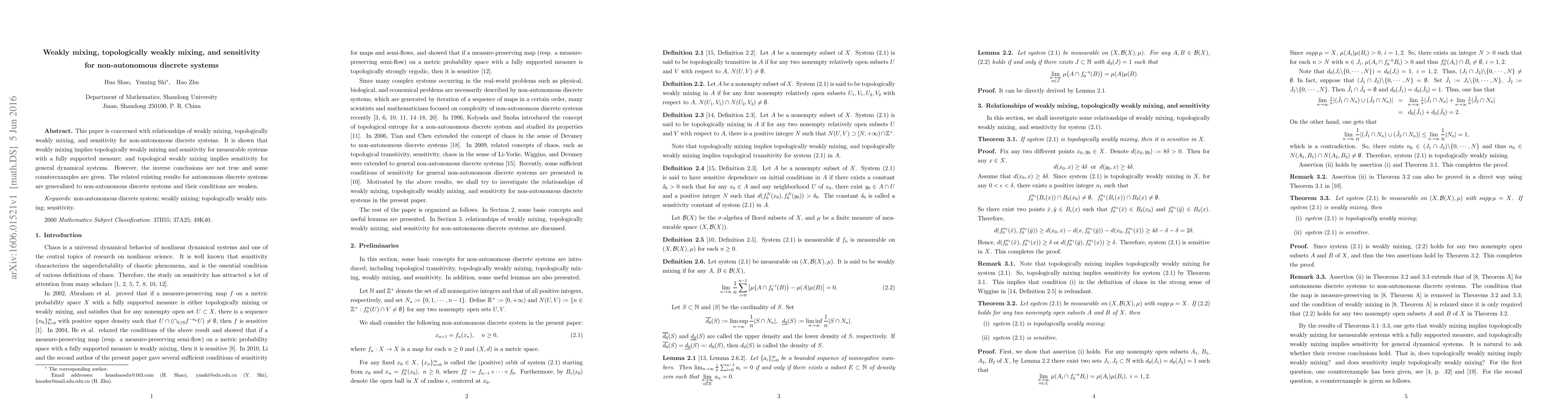 This paper explores relationships among weakly mixing, topologically weakly mixing, and sensitivity in non-autonomous discrete systems, proving that weakly mixing implies both topologically weakly mixing and sensitivity for measurable systems, while topologically weakly mixing implies sensitivity for general systems. Counterexamples show that the converses do not hold, and existing results for autonomous systems are generalized with weaker conditions for non-autonomous systems.