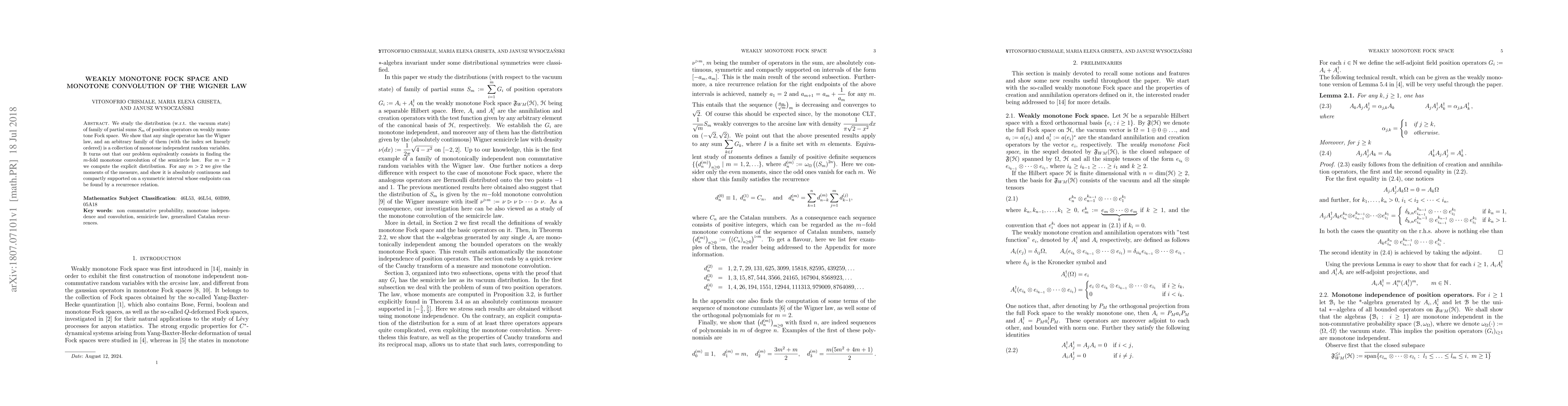 This paper investigates the distribution of partial sums of position operators within weakly monotone Fock space, demonstrating that they follow the Wigner law. It also explores the m-fold monotone convolution of the semicircle law, deriving explicit results for m=2 and moments for m>2, showing the measure is absolutely continuous and compactly supported on a symmetric interval determined by a recurrence relation.