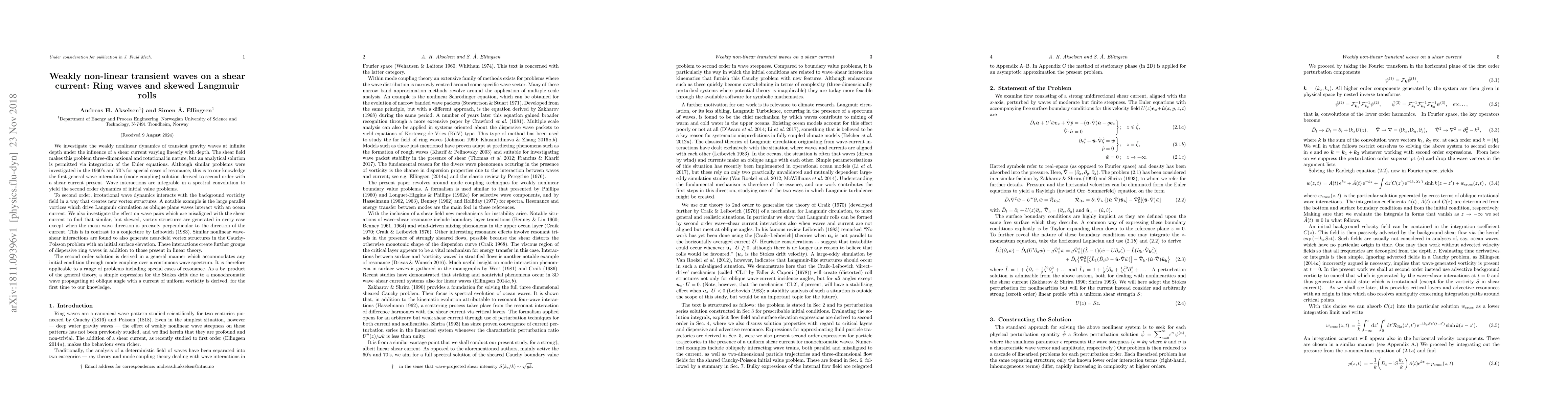 This paper presents an analytical solution for the weakly nonlinear dynamics of transient gravity waves under a shear current, deriving a second-order wave interaction solution that reveals the formation of skewed Langmuir rolls and ring waves. The study also provides a new expression for the Stokes drift in such conditions.