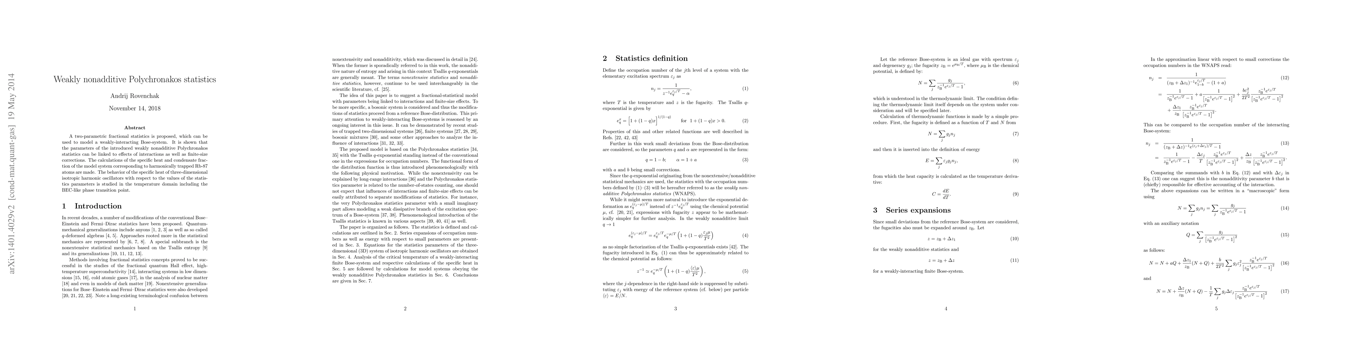 A two-parametric fractional statistics is proposed, which can be used to model a weakly-interacting Bose-system. It is shown that the parameters of the introduced weakly nonadditive Polychronakos statistics can be linked to effects of interactions as well as finite-size corrections. The calculations of the specific heat and condensate fraction of the model system corresponding to harmonically trapped Rb-87 atoms are made. The behavior of the specific heat of three-dimensional isotropic harmonic oscillators with respect to the values of the statistics parameters is studied in the temperature domain including the BEC-like phase transition point.