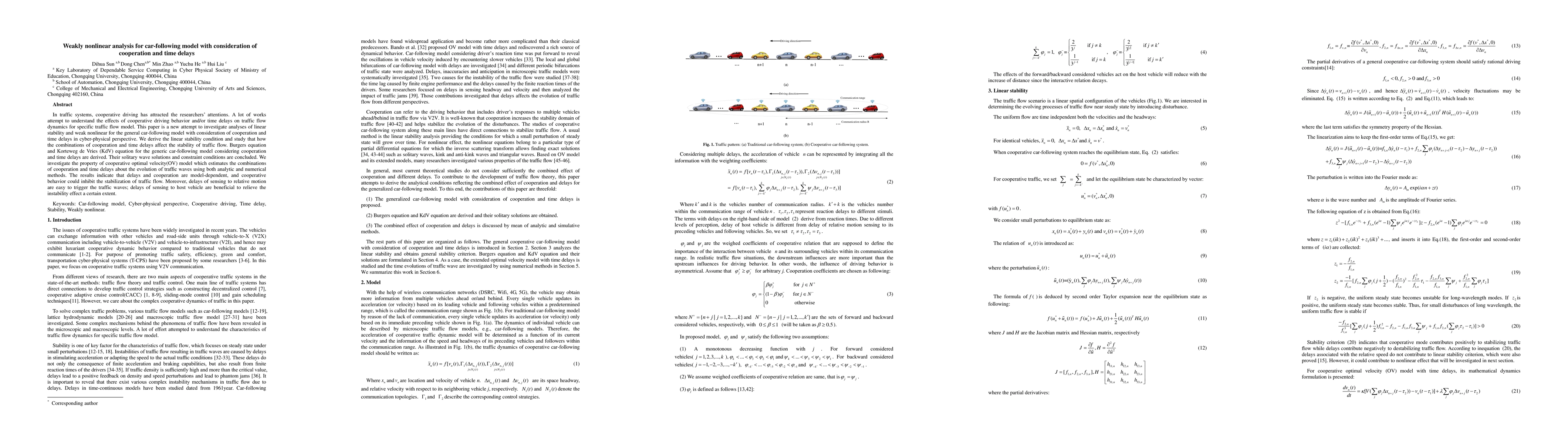 This paper analyzes the stability of a general car-following model with cooperative driving and time delays, deriving linear stability conditions and Burgers and KdV equations. It finds that cooperation can destabilize traffic flow, while certain delays can mitigate instability.