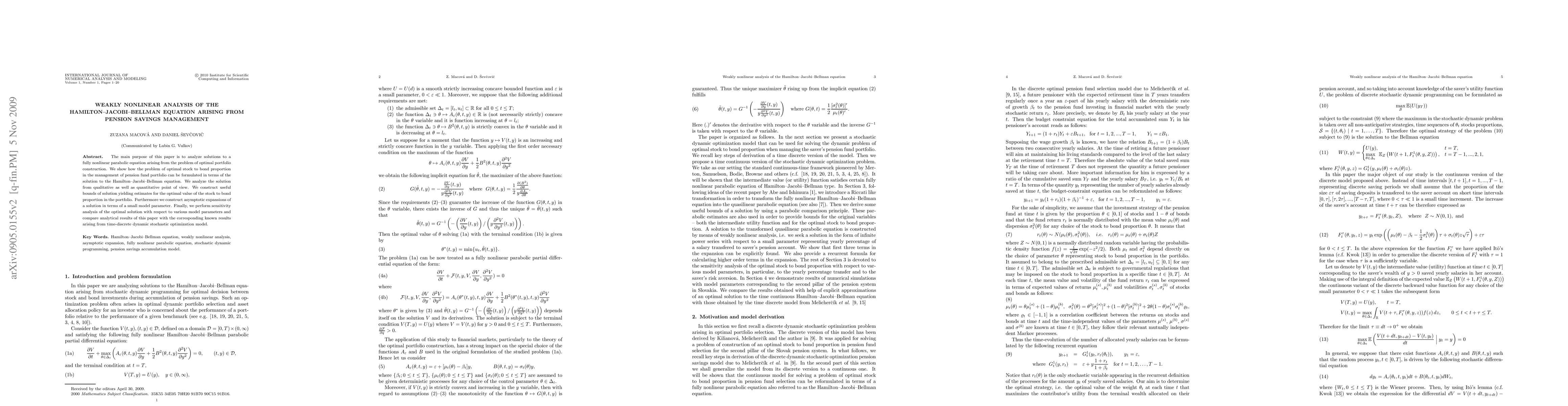The main purpose of this paper is to analyze solutions to a fully nonlinear parabolic equation arising from the problem of optimal portfolio construction. We show how the problem of optimal stock to bond proportion in the management of pension fund portfolio can be formulated in terms of the solution to the Hamilton-Jacobi-Bellman equation. We analyze the solution from qualitative as well as quantitative point of view. We construct useful bounds of solution yielding estimates for the optimal value of the stock to bond proportion in the portfolio. Furthermore we construct asymptotic expansions of a solution in terms of a small model parameter. Finally, we perform sensitivity analysis of the optimal solution with respect to various model parameters and compare analytical results of this paper with the corresponding known results arising from time-discrete dynamic stochastic optimization model.
