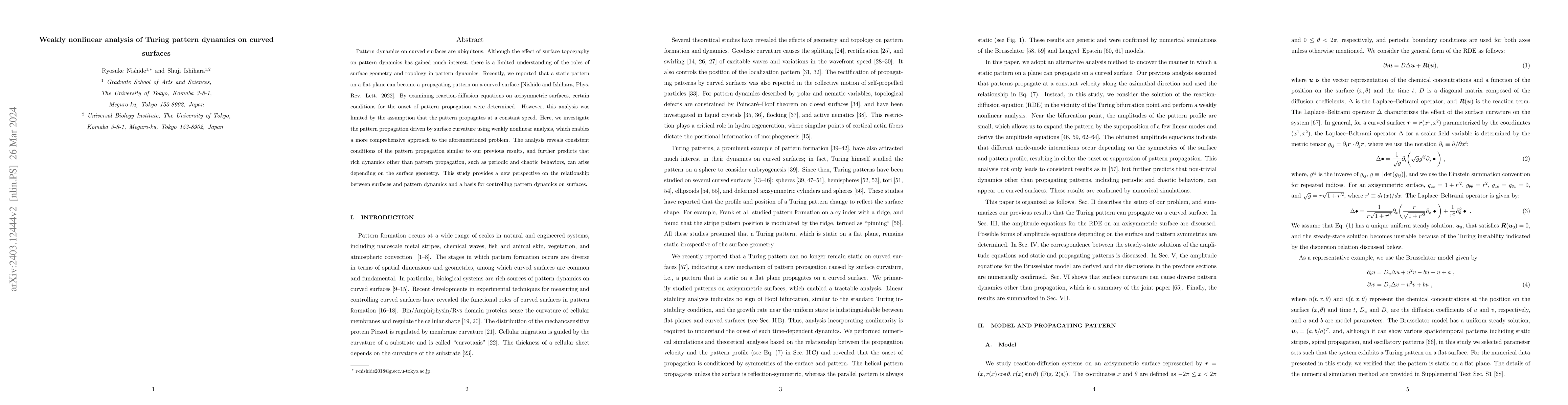 This research paper uses weakly nonlinear analysis to explore the dynamics of Turing patterns on curved surfaces, revealing conditions for pattern propagation and predicting additional dynamics like periodic and chaotic behaviors influenced by surface geometry. It offers new insights into controlling pattern dynamics on surfaces.