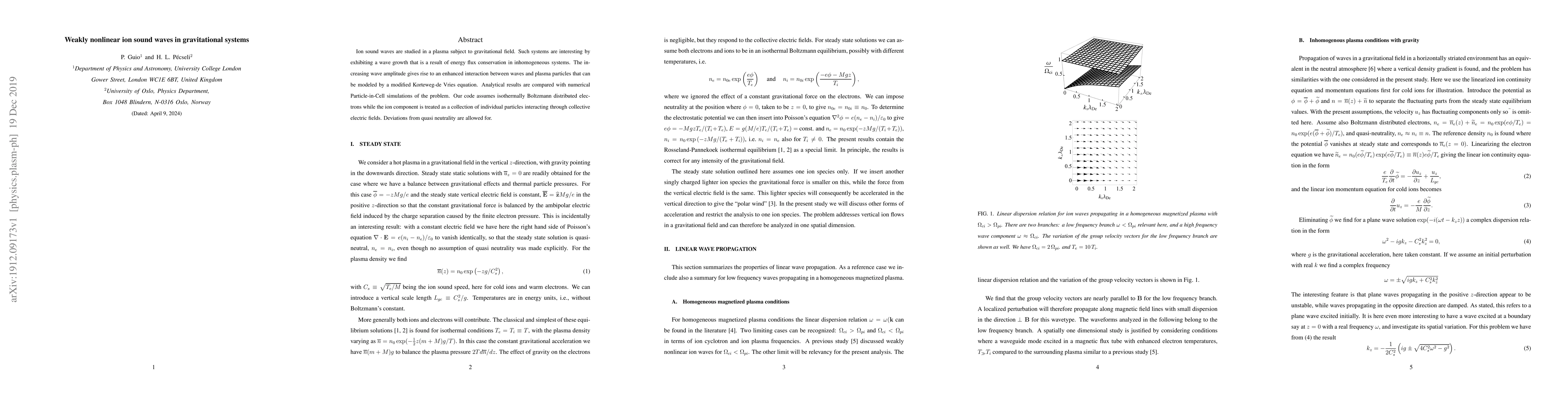 Ion sound waves are studied in a plasma subject to gravitational field. Such systems are interesting by exhibiting a wave growth that is a result of energy flux conservation in inhomogeneous systems. The increasing wave amplitude gives rise to an enhanced interaction between waves and plasma particles that can be modeled by a modified Korteweg-de Vries equation. Analytical results are compared with numerical Particle-in-Cell simulations of the problem. Our code assumes isothermally Boltzmann distributed electrons while the ion component is treated as a collection of individual particles interacting through collective electric fields. Deviations from quasi neutrality are allowed for.
