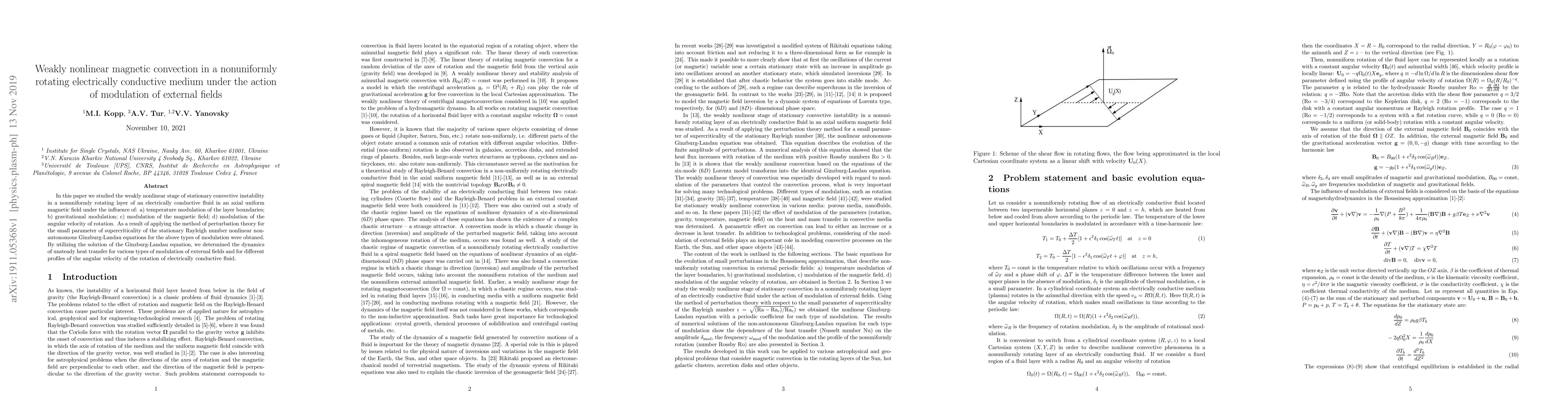 This paper investigates the weakly nonlinear stage of convective instability in a nonuniformly rotating, electrically conductive fluid under an axial magnetic field, modulated by temperature, gravity, magnetic field, and angular velocity. It derives nonlinear non-autonomous Ginzburg-Landau equations and uses their solutions to analyze the dynamics of unsteady heat transfer under various modulations.
