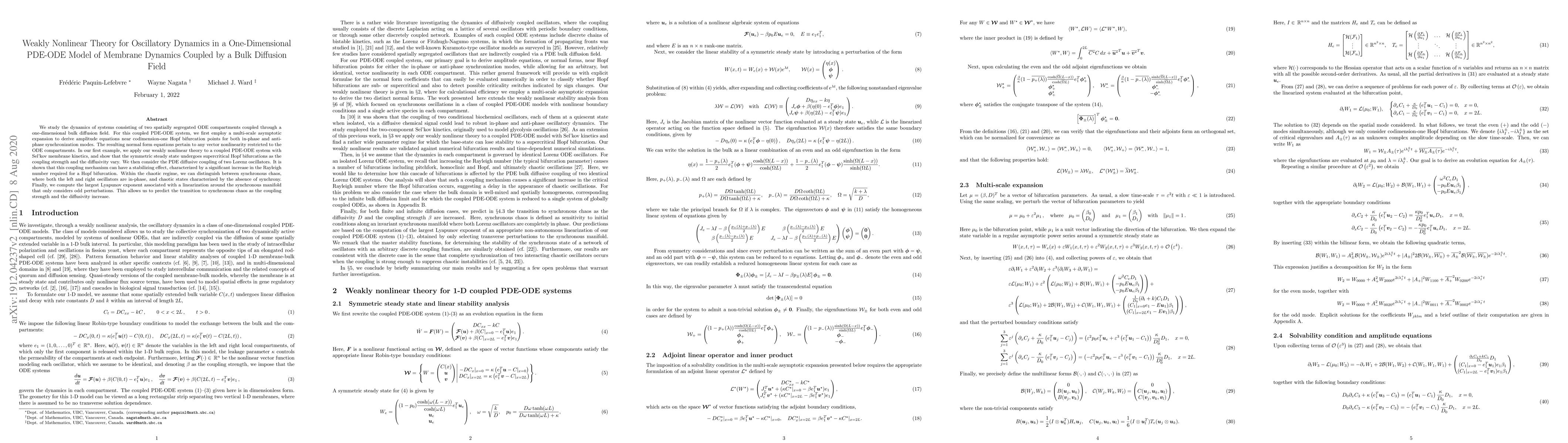 We study the dynamics of systems consisting of two spatially segregated ODE compartments coupled through a one-dimensional bulk diffusion field. For this coupled PDE-ODE system, we first employ a multi-scale asymptotic expansion to derive amplitude equations near codimension-one Hopf bifurcation points for both in-phase and anti-phase synchronization modes. The resulting normal form equations pertain to any vector nonlinearity restricted to the ODE compartments. In our first example, we apply our weakly nonlinear theory to a coupled PDE-ODE system with Sel'kov membrane kinetics, and show that the symmetric steady state undergoes supercritical Hopf bifurcations as the coupling strength and the diffusivity vary. We then consider the PDE diffusive coupling of two Lorenz oscillators. It is shown that this coupling mechanism can have a stabilizing effect, characterized by a significant increase in the Rayleigh number required for a Hopf bifurcation. Within the chaotic regime, we can distinguish between synchronous chaos, where both the left and right oscillators are in-phase, and chaotic states characterized by the absence of synchrony. Finally, we compute the largest Lyapunov exponent associated with a linearization around the synchronous manifold that only considers odd perturbations. This allows us to predict the transition to synchronous chaos as the coupling strength and the diffusivity increase.