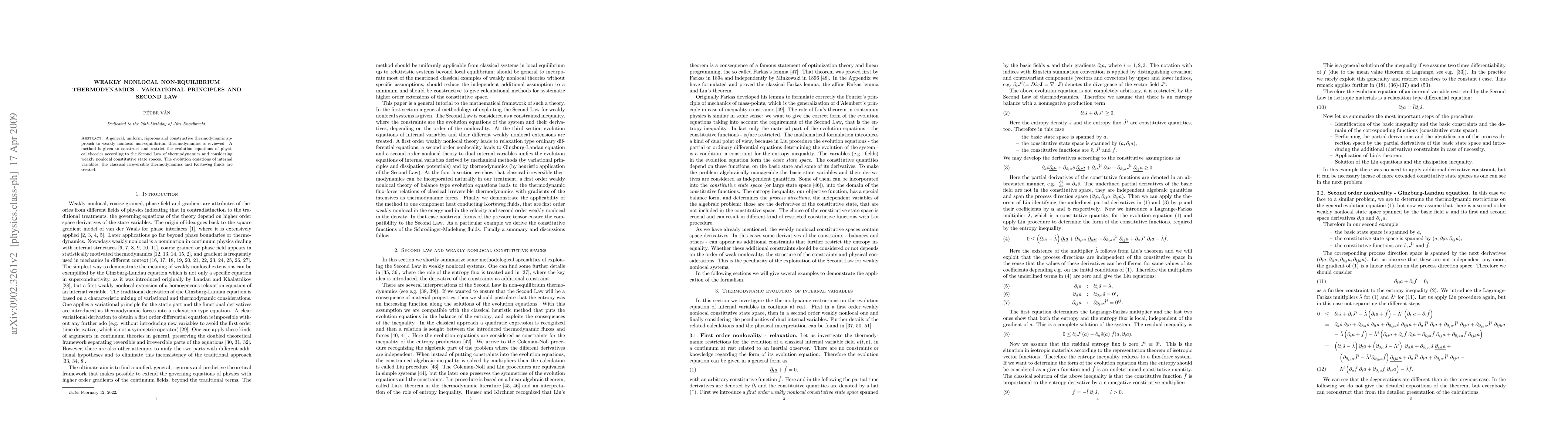 A general, uniform, rigorous and constructive thermodynamic approach to weakly nonlocal non-equilibrium thermodynamics is reviewed. A method is given to construct and restrict the evolution equations of physical theories according to the Second Law of thermodynamics and considering weakly nonlocal constitutive state spaces. The evolution equations of internal variables, the classical irreversible thermodynamics and Korteweg fluids are treated.