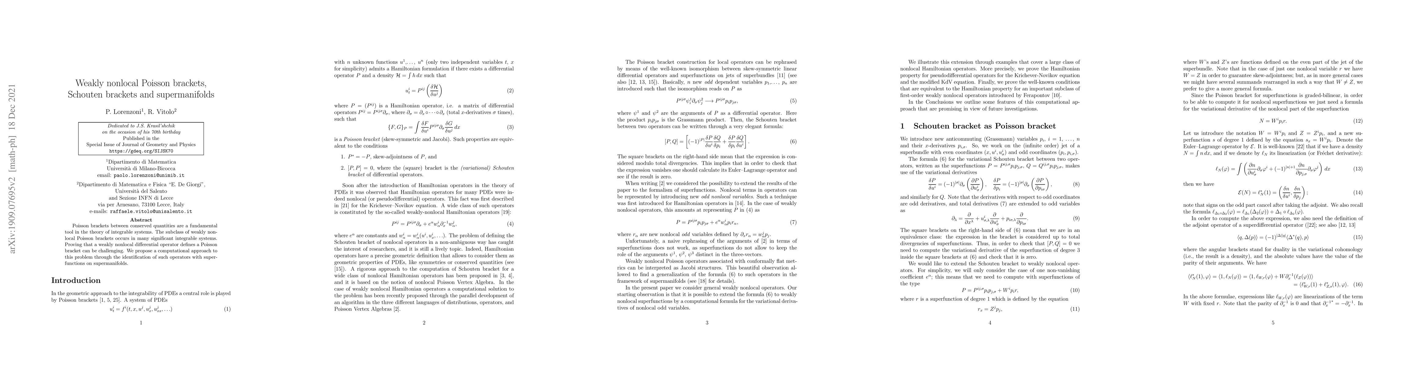 This paper explores the identification of weakly nonlocal Poisson brackets with superfunctions on supermanifolds, offering a new computational approach to determine if a given differential operator defines a Poisson bracket in integrable systems. The method leverages the structure of Schouten brackets and supermanifolds to address the challenge of verifying nonlocal Poisson brackets.