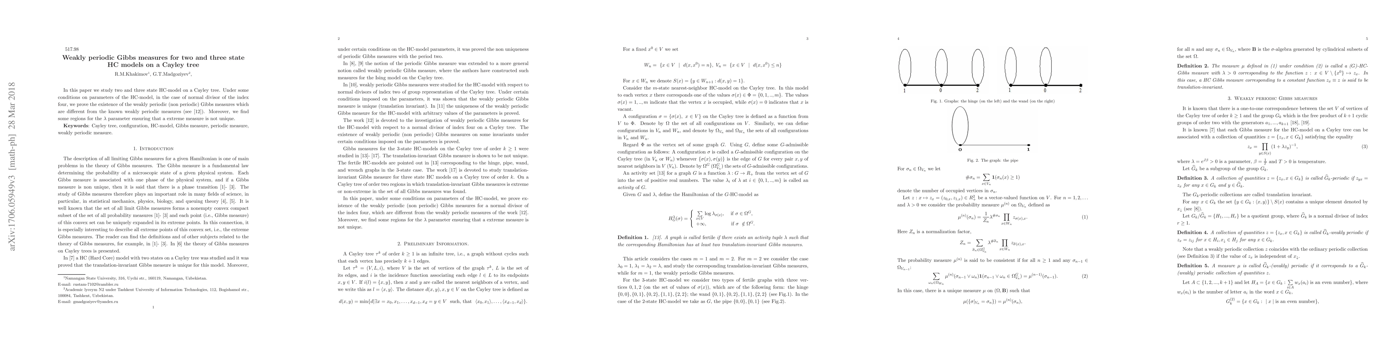 This paper investigates two and three state HC-models on a Cayley tree, proving the existence of weakly periodic Gibbs measures under specific conditions. It also identifies parameter regions where extreme measures are not unique.