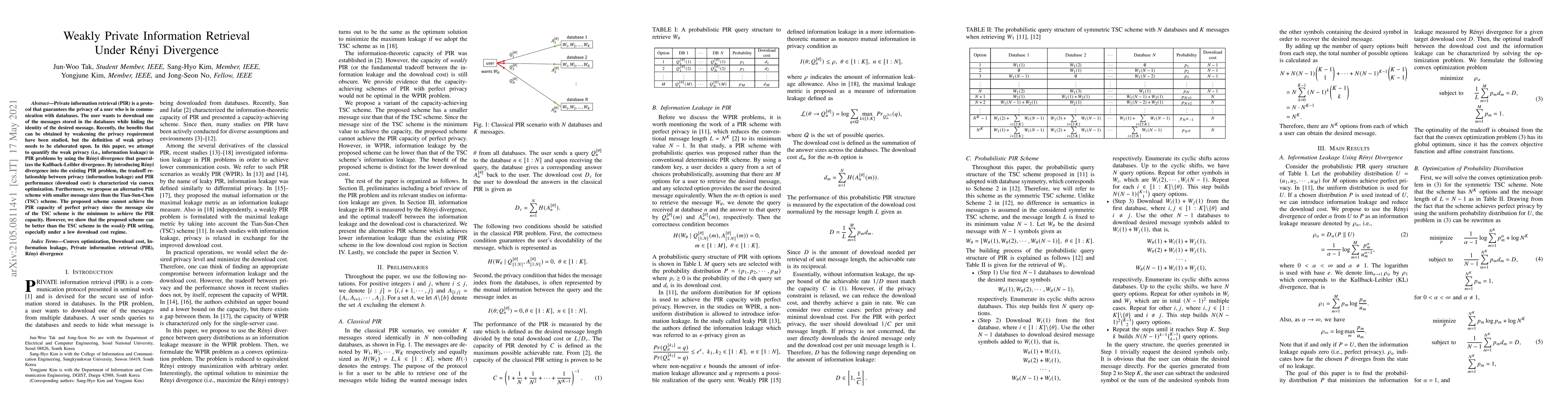 Private information retrieval (PIR) is a protocol that guarantees the privacy of a user who is in communication with databases. The user wants to download one of the messages stored in the databases while hiding the identity of the desired message. Recently, the benefits that can be obtained by weakening the privacy requirement have been studied, but the definition of weak privacy needs to be elaborated upon. In this paper, we attempt to quantify the weak privacy (i.e., information leakage) in PIR problems by using the R\'enyi divergence that generalizes the Kullback-Leibler divergence. By introducing R\'enyi divergence into the existing PIR problem, the tradeoff relationship between privacy (information leakage) and PIR performance (download cost) is characterized via convex optimization. Furthermore, we propose an alternative PIR scheme with smaller message sizes than the Tian-Sun-Chen (TSC) scheme. The proposed scheme cannot achieve the PIR capacity of perfect privacy since the message size of the TSC scheme is the minimum to achieve the PIR capacity. However, we show that the proposed scheme can be better than the TSC scheme in the weakly PIR setting, especially under a low download cost regime.