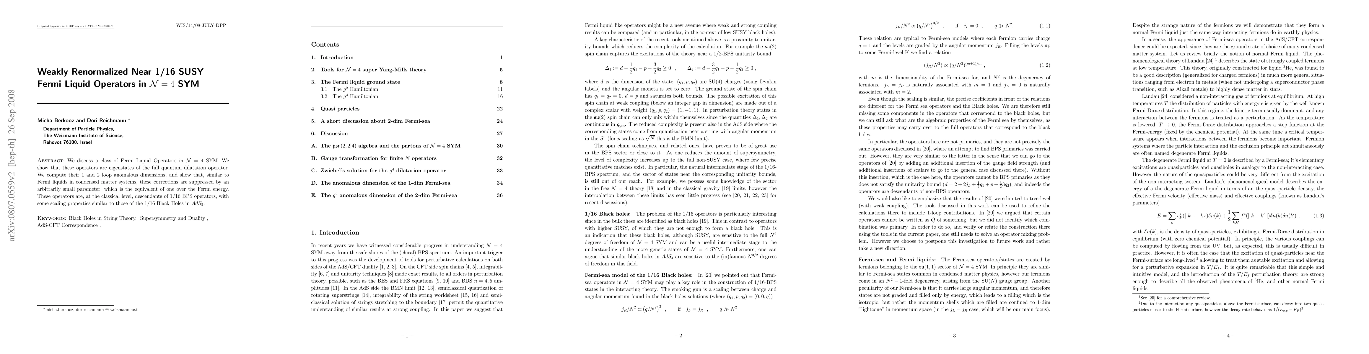 We discuss a class of Fermi Liquid Operators in N = 4 SYM. We show that these operators are eigenstates of the full quantum dilatation operator. We compute their 1 and 2 loop anomalous dimensions, and show that, similar to Fermi liquids in condensed matter systems, these corrections are suppressed by an arbitrarily small parameter, which is the equivalent of one over the Fermi energy. These operators are, at the classical level, descendants of 1/16 BPS operators, with some scaling properties similar to those of the 1/16 Black Holes in AdS_5.