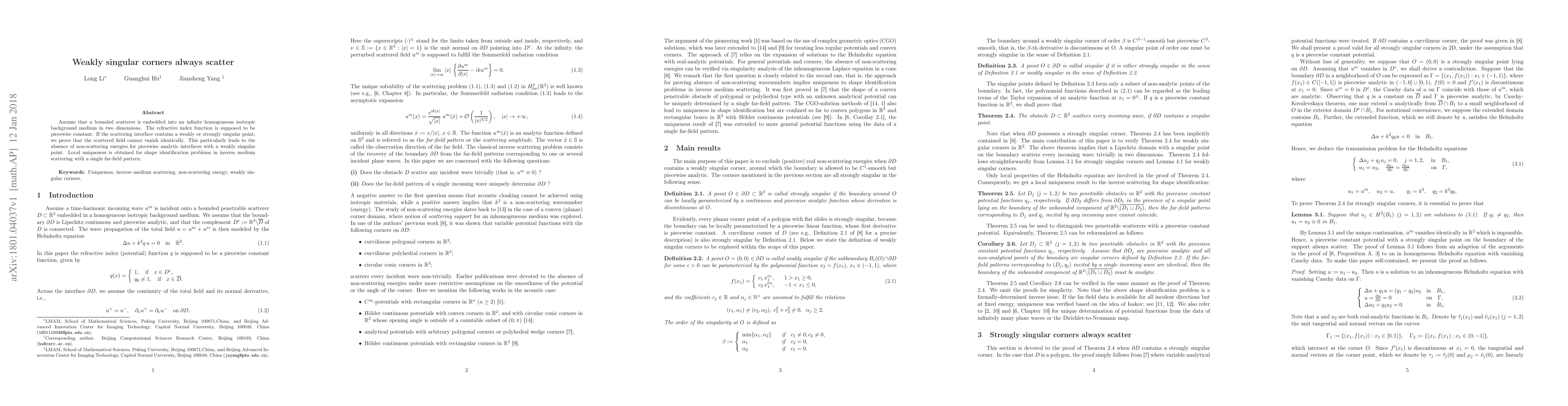 Assume that a bounded scatterer is embedded into an infinite homogeneous isotropic background medium in two dimensions. The refractive index function is supposed to be piecewise constant. If the scattering interface contains a weakly or strongly singular point, we prove that the scattered field cannot vanish identically. This particularly leads to the absence of non-scattering energies for piecewise analytic interfaces with a weakly singular point. Local uniqueness is obtained for shape identification problems in inverse medium scattering with a single far-field pattern.