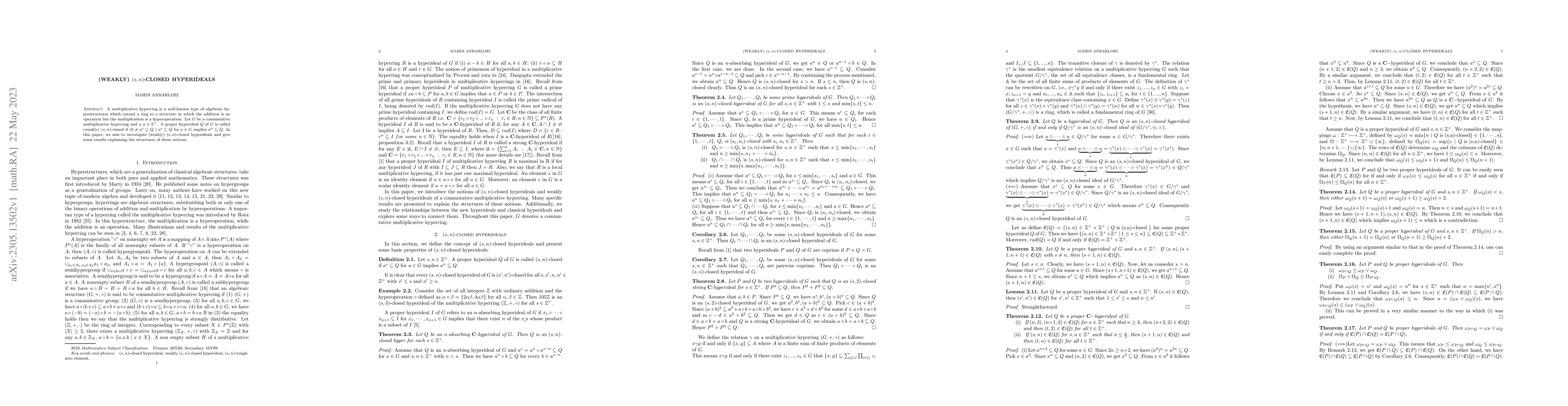 A multiplicative hyperring is a well-known type of algebraic hyperstructures which extend a ring to a structure in which the addition is an operation but multiplication is a hyperoperation. Let G be a commutative multiplicative hyperring and s,n \in Z^+. A proper hyperideal Q of G is called (weakly) (s,n)-closed if (0 \neq a^s \subseteq Q) s^s \subseteq Q for a\in G implies a^n \subseteq Q. In this paper, we aim to investigate (weakly) (s,n)-closed hyperideals and give some results explaining the structures of these notions.