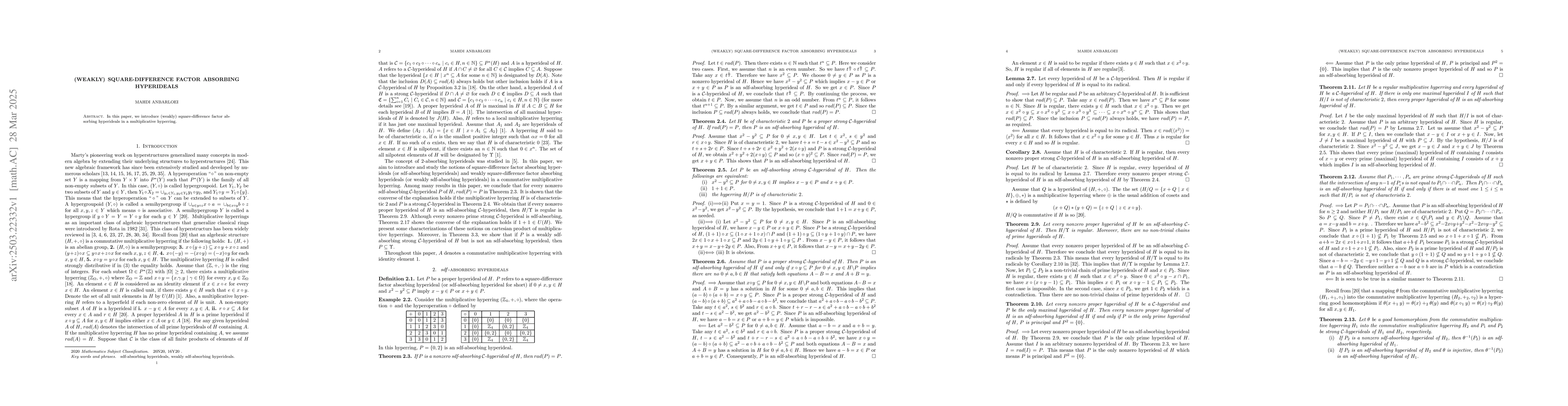 The paper introduces (weakly) square-difference factor absorbing hyperideals in multiplicative hyperrings, examining their properties and relationships with other hyperideal types.