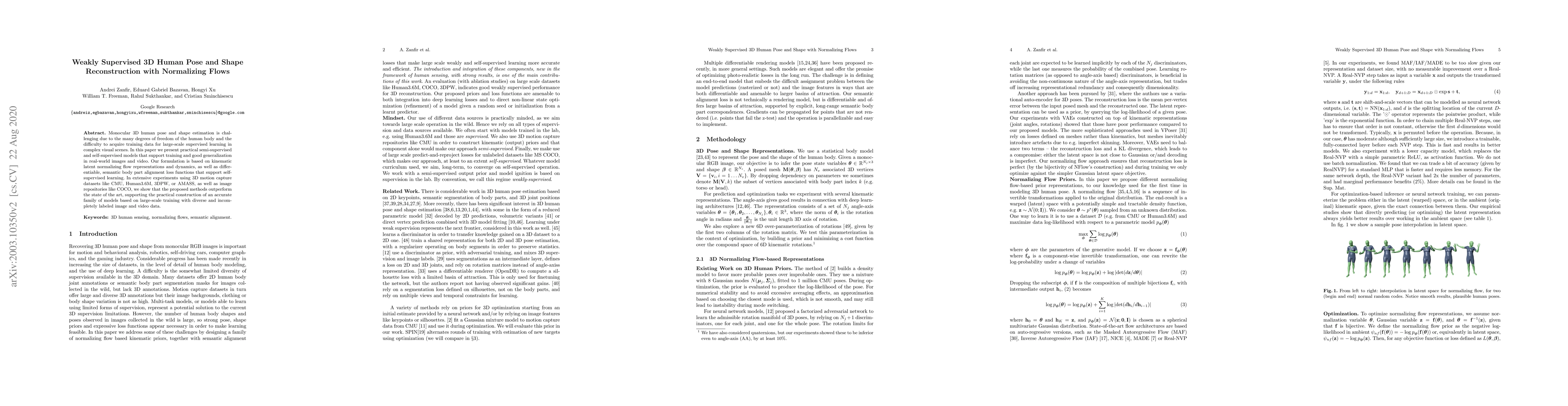 This paper introduces semi-supervised and self-supervised models for monocular 3D human pose and shape reconstruction using normalizing flows. It leverages kinematic latent representations and differentiable semantic body part alignment losses, achieving state-of-the-art results on various datasets, demonstrating effective training with large-scale, partially labeled data.
