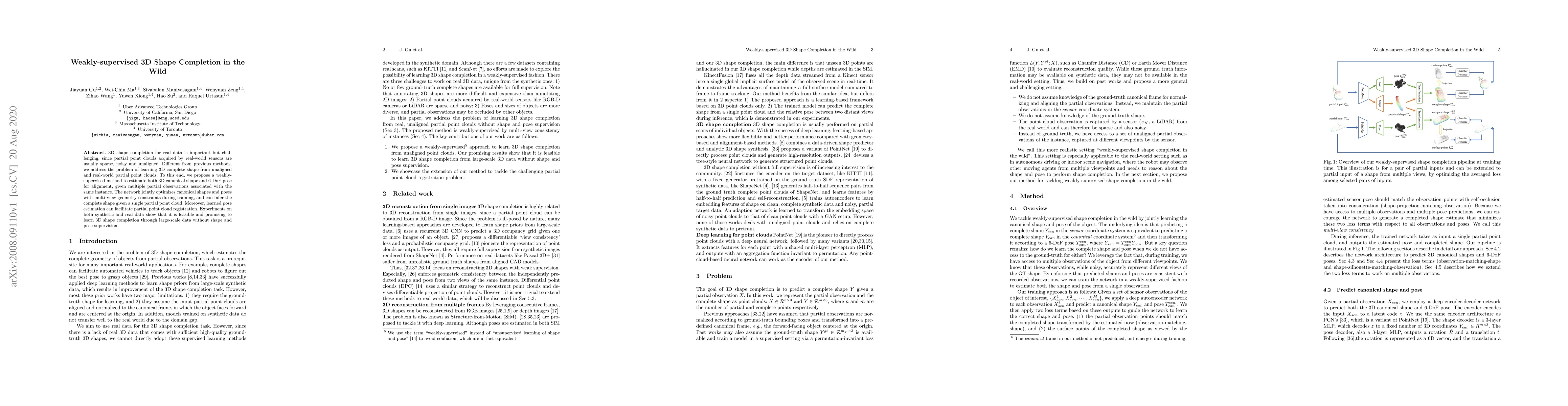 This paper proposes a weakly-supervised method for completing 3D shapes from sparse, noisy, and unaligned real-world partial point clouds. The network jointly optimizes 3D canonical shapes and 6-DoF poses using multi-view geometry constraints, enabling complete shape inference from single partial observations.