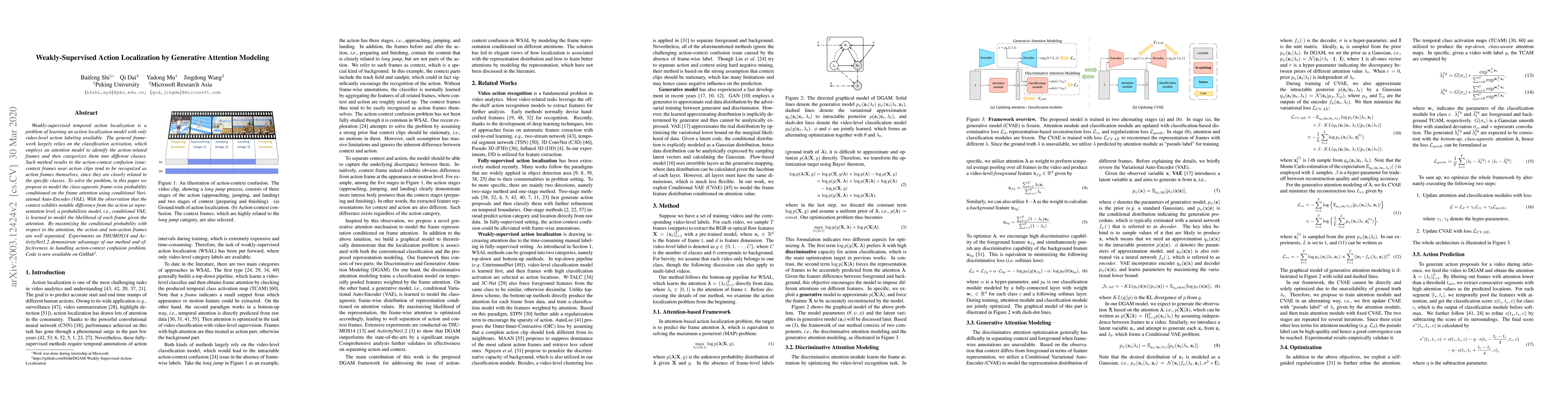 This paper proposes a weakly-supervised action localization method using a conditional Variational Auto-Encoder (VAE) to model frame-wise probabilities conditioned on frame attention, addressing the action-context confusion issue by effectively separating action and non-action frames. Experiments on THUMOS14 and ActivityNet1.2 show the method's effectiveness.