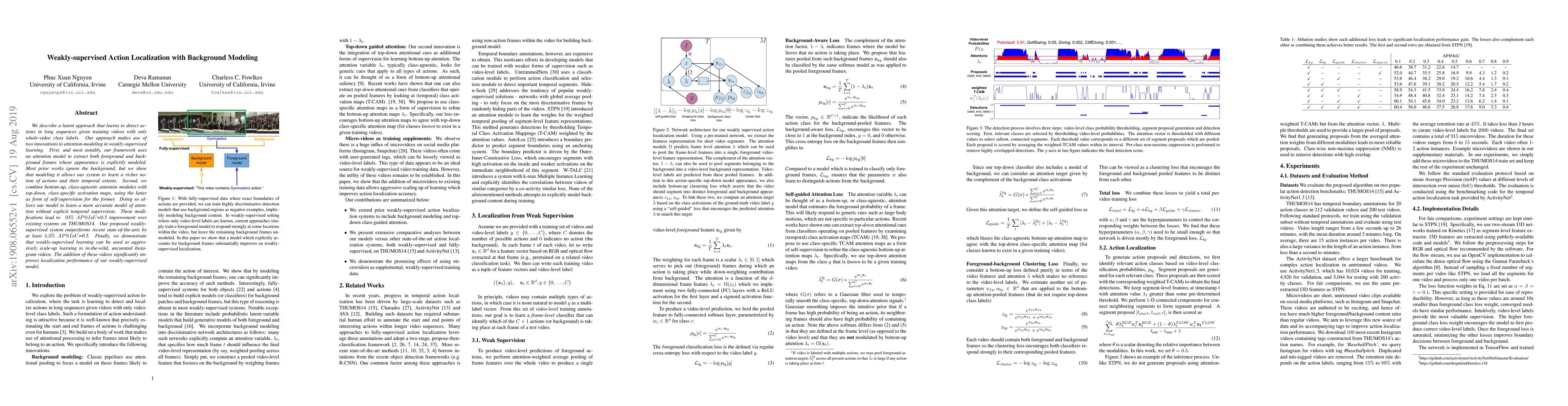 This paper proposes a novel weakly-supervised approach for action localization using only whole-video class labels. It models both foreground and background frames to learn a richer notion of actions, and combines bottom-up and top-down attention mechanisms to improve accuracy without temporal supervision, achieving a 10% improvement over existing methods on THUMOS14.