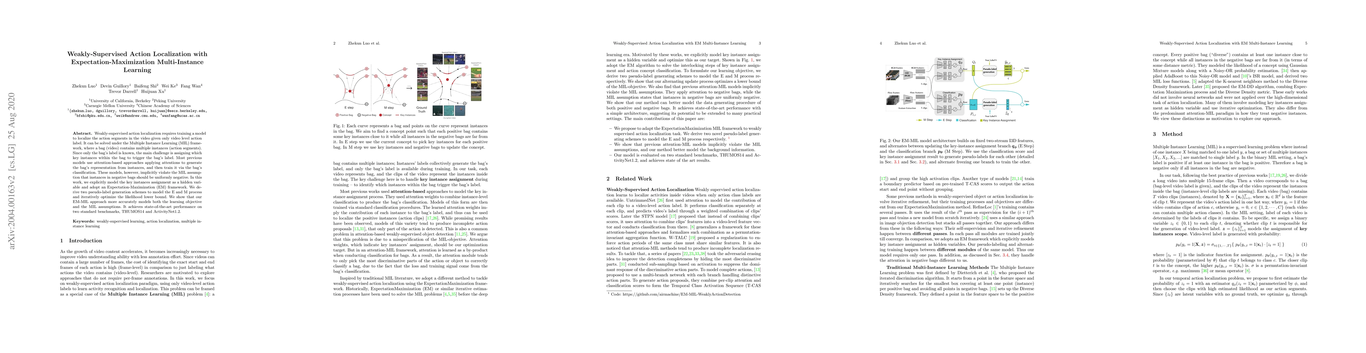 This paper proposes an Expectation-Maximization (EM) framework for weakly-supervised action localization using Multi-Instance Learning (MIL). It accurately models key instance assignment as a hidden variable, achieving state-of-the-art results on THUMOS14 and ActivityNet1.2 benchmarks.