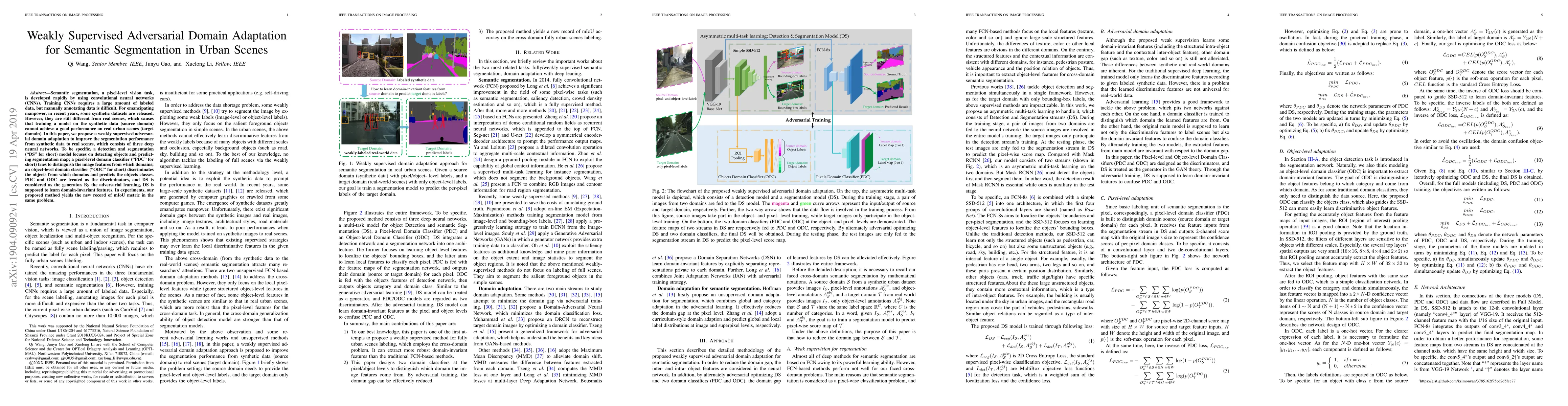 This paper proposes a weakly supervised adversarial domain adaptation method for semantic segmentation, utilizing three neural networks to improve performance from synthetic to real urban scenes. The method achieves domain-invariant feature learning through adversarial training, setting a new record in the mIoU metric.