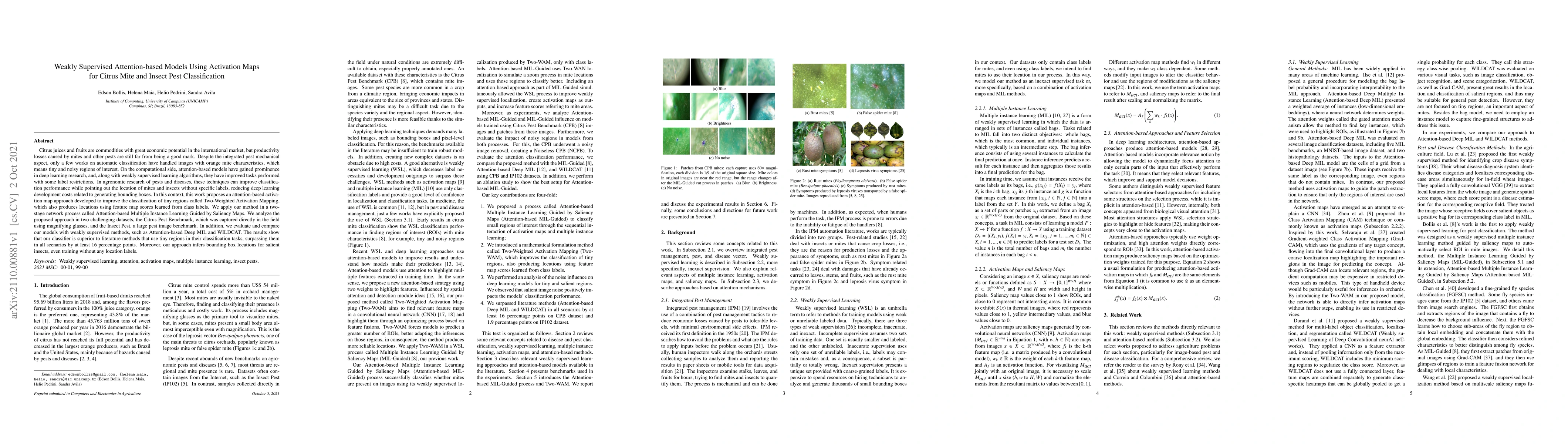 Citrus juices and fruits are commodities with great economic potential in the international market, but productivity losses caused by mites and other pests are still far from being a good mark. Despite the integrated pest mechanical aspect, only a few works on automatic classification have handled images with orange mite characteristics, which means tiny and noisy regions of interest. On the computational side, attention-based models have gained prominence in deep learning research, and, along with weakly supervised learning algorithms, they have improved tasks performed with some label restrictions. In agronomic research of pests and diseases, these techniques can improve classification performance while pointing out the location of mites and insects without specific labels, reducing deep learning development costs related to generating bounding boxes. In this context, this work proposes an attention-based activation map approach developed to improve the classification of tiny regions called Two-Weighted Activation Mapping, which also produces locations using feature map scores learned from class labels. We apply our method in a two-stage network process called Attention-based Multiple Instance Learning Guided by Saliency Maps. We analyze the proposed approach in two challenging datasets, the Citrus Pest Benchmark, which was captured directly in the field using magnifying glasses, and the Insect Pest, a large pest image benchmark. In addition, we evaluate and compare our models with weakly supervised methods, such as Attention-based Deep MIL and WILDCAT. The results show that our classifier is superior to literature methods that use tiny regions in their classification tasks, surpassing them in all scenarios by at least 16 percentage points. Moreover, our approach infers bounding box locations for salient insects, even training without any location labels.