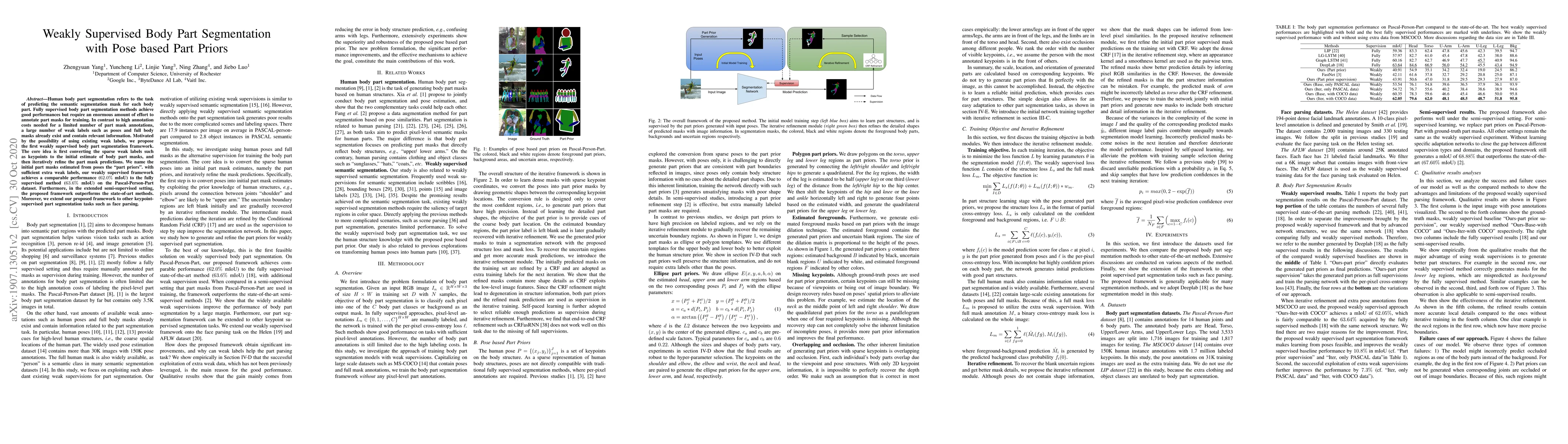 This paper introduces a weakly supervised framework for human body part segmentation, utilizing pose-based "part priors" to convert sparse weak labels into initial body part masks, which are iteratively refined. The approach achieves comparable results to fully supervised methods while leveraging existing weak labels, and outperforms existing methods in semi-supervised settings.