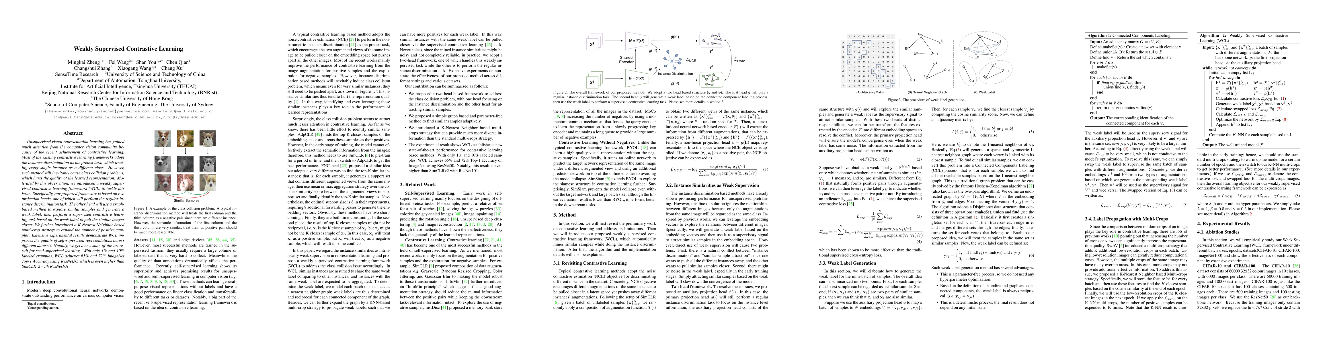 The paper proposes a weakly supervised contrastive learning framework (WCL) to improve visual representation learning by addressing class collision issues. WCL uses two projection heads, one for instance discrimination and another for generating weak labels via graph-based methods, enhancing the learning of similar samples. Experimental results show that WCL significantly improves representation quality and achieves state-of-the-art semi-supervised learning on ImageNet.