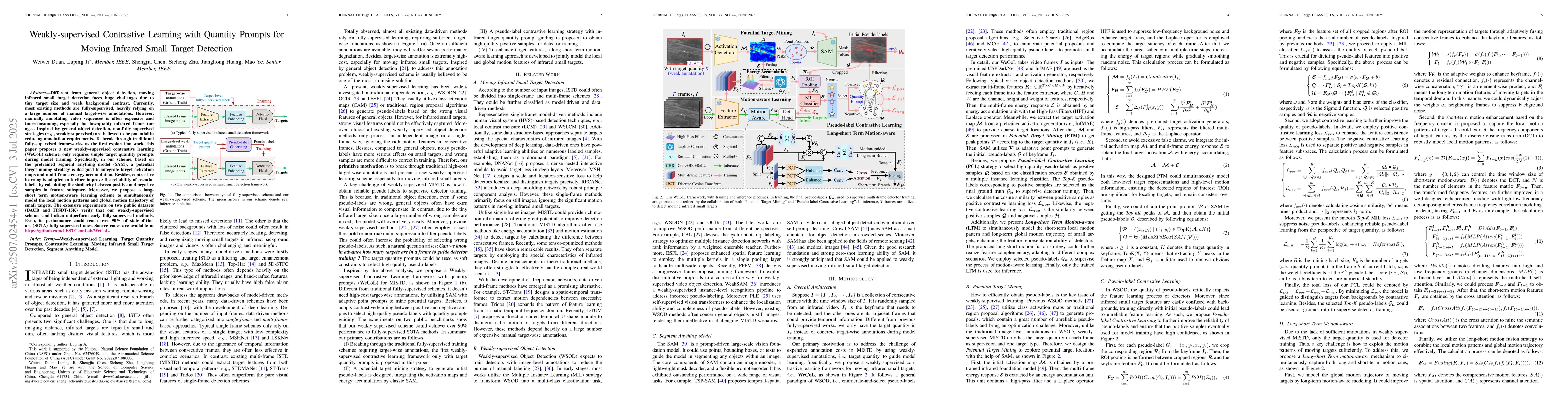 This paper introduces a weakly-supervised contrastive learning (WeCoL) method for moving infrared small target detection, reducing the need for manual annotations. The approach uses simple target quantity prompts, potential target mining, contrastive learning for pseudo-label reliability, and a long-short term motion-aware learning scheme. Results show the method often outperforms early fully-supervised methods, achieving over 90% of state-of-the-art performance.