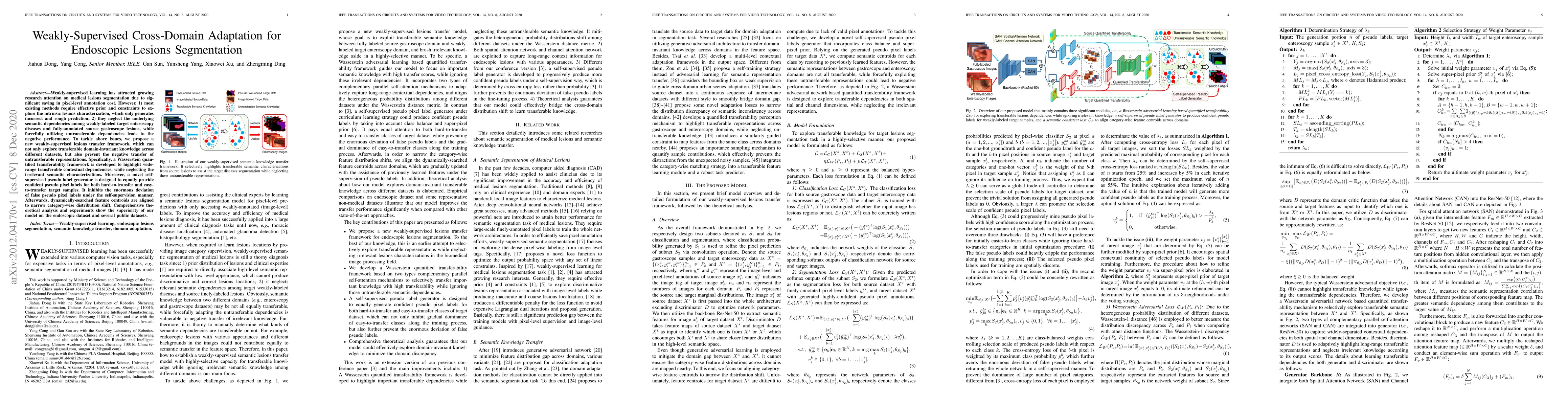 Weakly-supervised learning has attracted growing research attention on medical lesions segmentation due to significant saving in pixel-level annotation cost. However, 1) most existing methods require effective prior and constraints to explore the intrinsic lesions characterization, which only generates incorrect and rough prediction; 2) they neglect the underlying semantic dependencies among weakly-labeled target enteroscopy diseases and fully-annotated source gastroscope lesions, while forcefully utilizing untransferable dependencies leads to the negative performance. To tackle above issues, we propose a new weakly-supervised lesions transfer framework, which can not only explore transferable domain-invariant knowledge across different datasets, but also prevent the negative transfer of untransferable representations. Specifically, a Wasserstein quantified transferability framework is developed to highlight widerange transferable contextual dependencies, while neglecting the irrelevant semantic characterizations. Moreover, a novel selfsupervised pseudo label generator is designed to equally provide confident pseudo pixel labels for both hard-to-transfer and easyto-transfer target samples. It inhibits the enormous deviation of false pseudo pixel labels under the self-supervision manner. Afterwards, dynamically-searched feature centroids are aligned to narrow category-wise distribution shift. Comprehensive theoretical analysis and experiments show the superiority of our model on the endoscopic dataset and several public datasets.