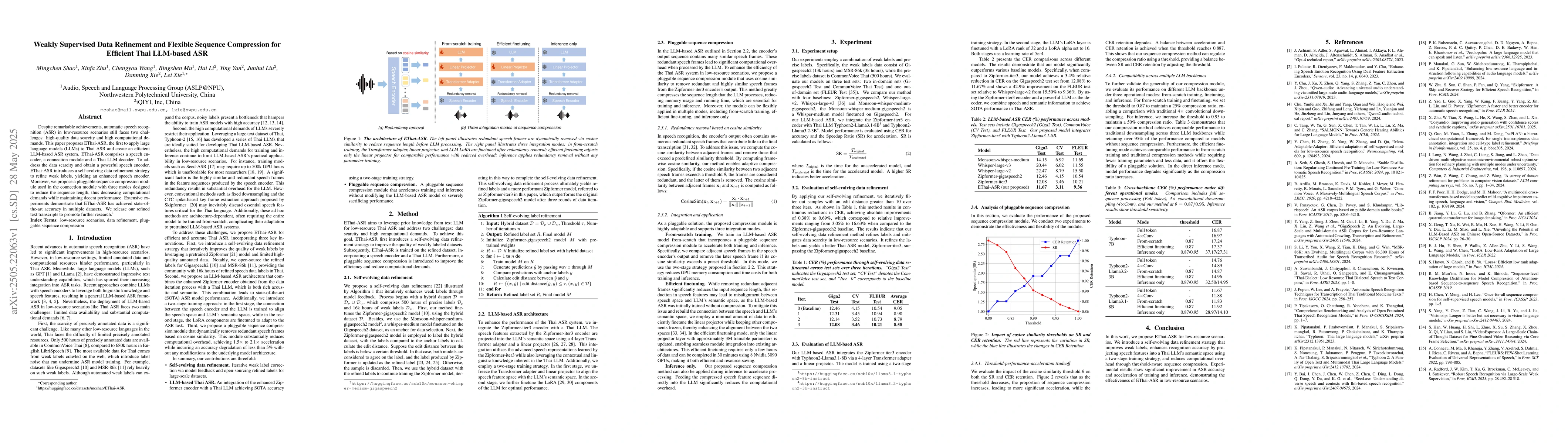 The research proposes EThai-ASR, an LLM-based Thai ASR system comprising a speech encoder, a connection module, and a Thai LLM decoder. It introduces a self-evolving data refinement strategy for enhancing the speech encoder and a pluggable sequence compression module to reduce computational demands.