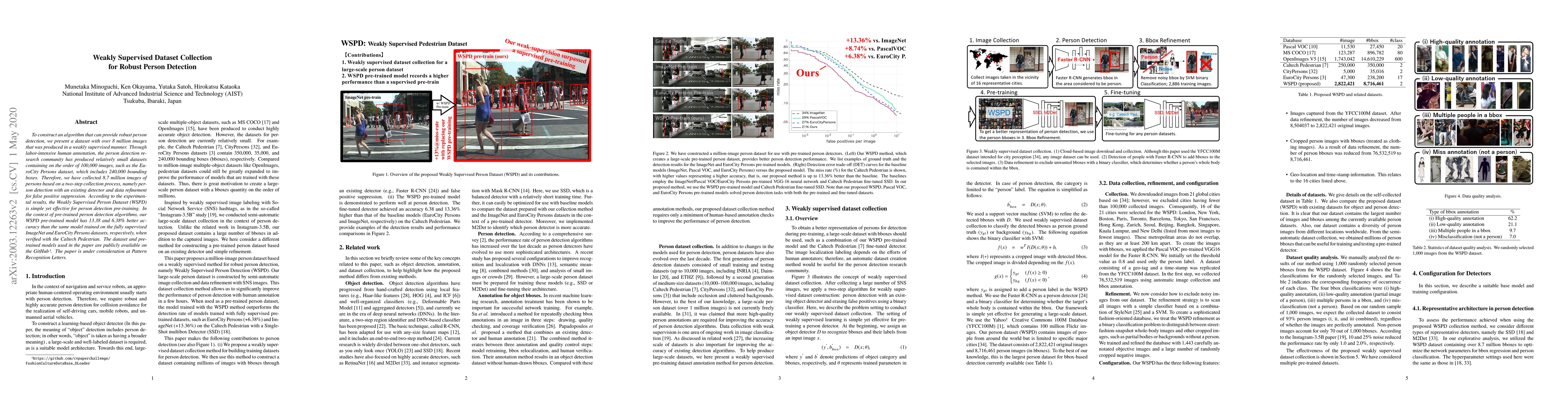 To construct an algorithm that can provide robust person detection, we present a dataset with over 8 million images that was produced in a weakly supervised manner. Through labor-intensive human annotation, the person detection research community has produced relatively small datasets containing on the order of 100,000 images, such as the EuroCity Persons dataset, which includes 240,000 bounding boxes. Therefore, we have collected 8.7 million images of persons based on a two-step collection process, namely person detection with an existing detector and data refinement for false positive suppression. According to the experimental results, the Weakly Supervised Person Dataset (WSPD) is simple yet effective for person detection pre-training. In the context of pre-trained person detection algorithms, our WSPD pre-trained model has 13.38 and 6.38% better accuracy than the same model trained on the fully supervised ImageNet and EuroCity Persons datasets, respectively, when verified with the Caltech Pedestrian.