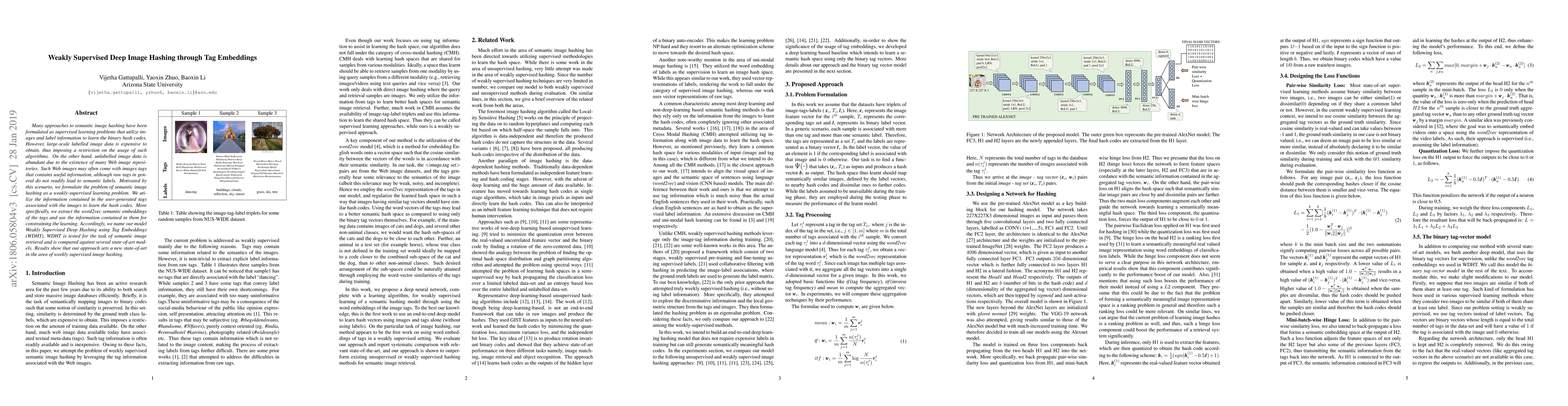 This paper proposes a weakly supervised deep hashing method, named WDHT, that leverages user-generated image tags to learn semantic hash codes without the need for extensive labeled data. The model uses word2vec embeddings of tags to guide the learning process, achieving superior performance in semantic image retrieval compared to existing methods.