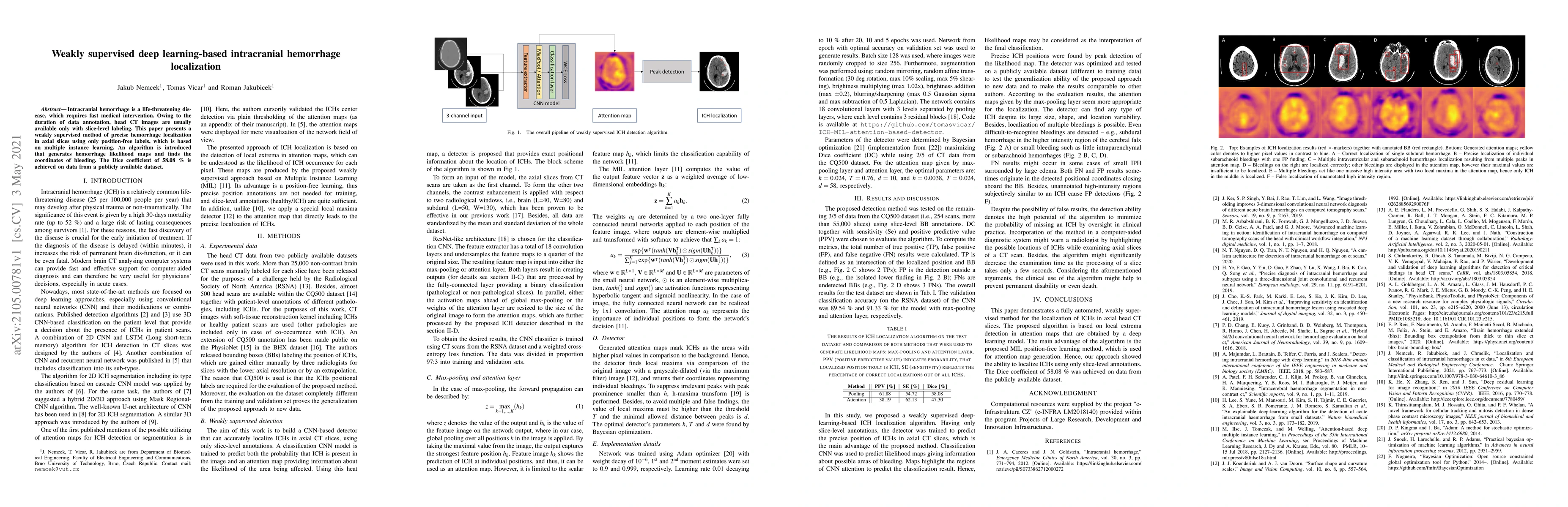 Intracranial hemorrhage is a life-threatening disease, which requires fast medical intervention. Owing to the duration of data annotation, head CT images are usually available only with slice-level labeling. This paper presents a weakly supervised method of precise hemorrhage localization in axial slices using only position-free labels, which is based on multiple instance learning. An algorithm is introduced that generates hemorrhage likelihood maps and finds the coordinates of bleeding. The Dice coefficient of 58.08 % is achieved on data from a publicly available dataset.