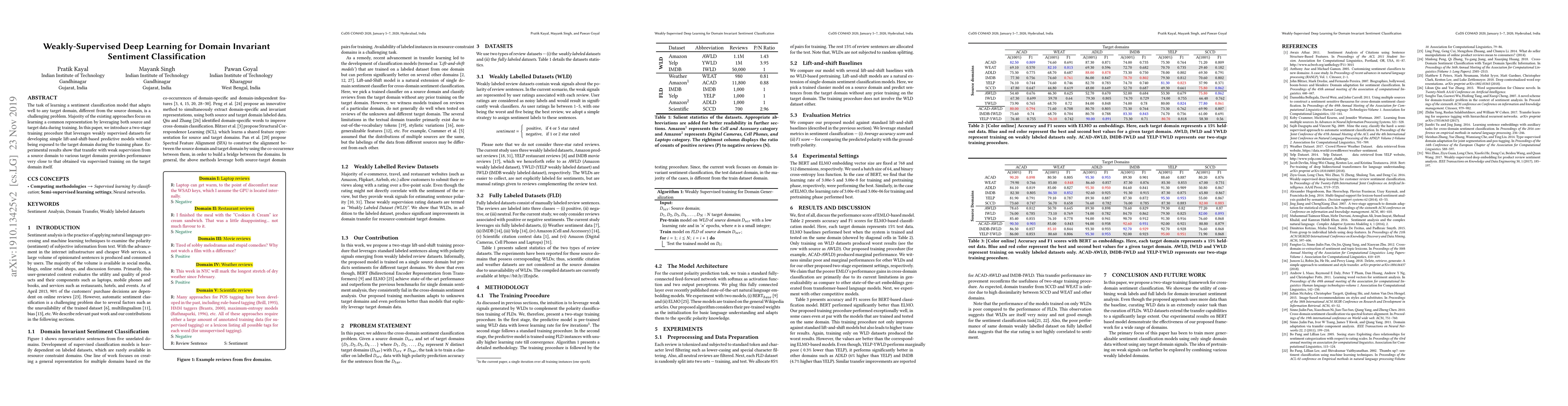 This paper proposes a two-stage training method for domain invariant sentiment classification using weakly supervised datasets, achieving performance comparable to supervised training on target domains. The approach avoids direct exposure to target domain data during training, utilizing lift-and-shift predictive models.