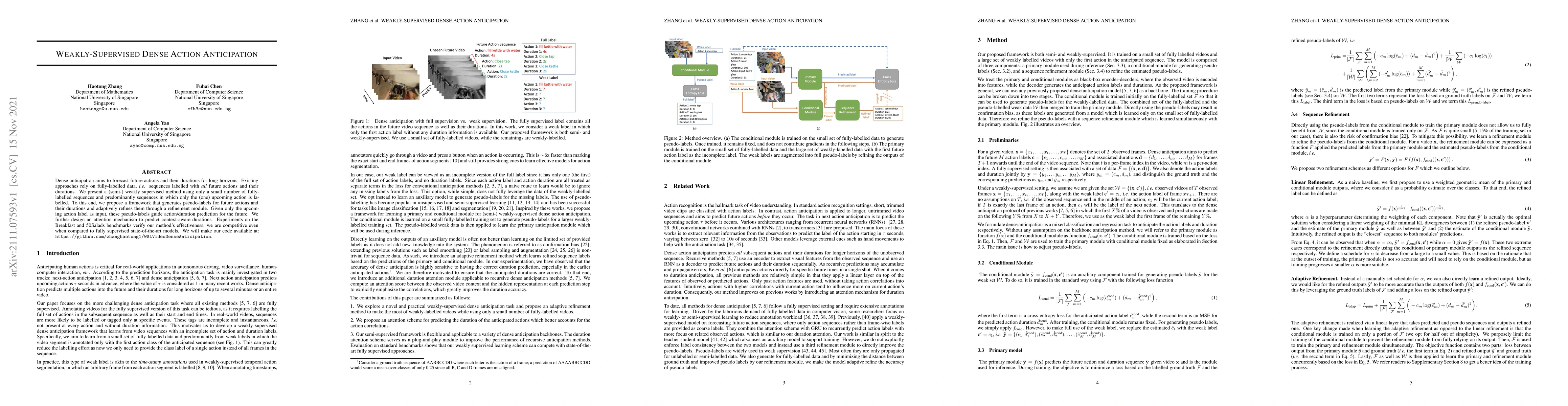 Dense anticipation aims to forecast future actions and their durations for long horizons. Existing approaches rely on fully-labelled data, i.e. sequences labelled with all future actions and their durations. We present a (semi-) weakly supervised method using only a small number of fully-labelled sequences and predominantly sequences in which only the (one) upcoming action is labelled. To this end, we propose a framework that generates pseudo-labels for future actions and their durations and adaptively refines them through a refinement module. Given only the upcoming action label as input, these pseudo-labels guide action/duration prediction for the future. We further design an attention mechanism to predict context-aware durations. Experiments on the Breakfast and 50Salads benchmarks verify our method's effectiveness; we are competitive even when compared to fully supervised state-of-the-art models. We will make our code available at: https://github.com/zhanghaotong1/WSLVideoDenseAnticipation.