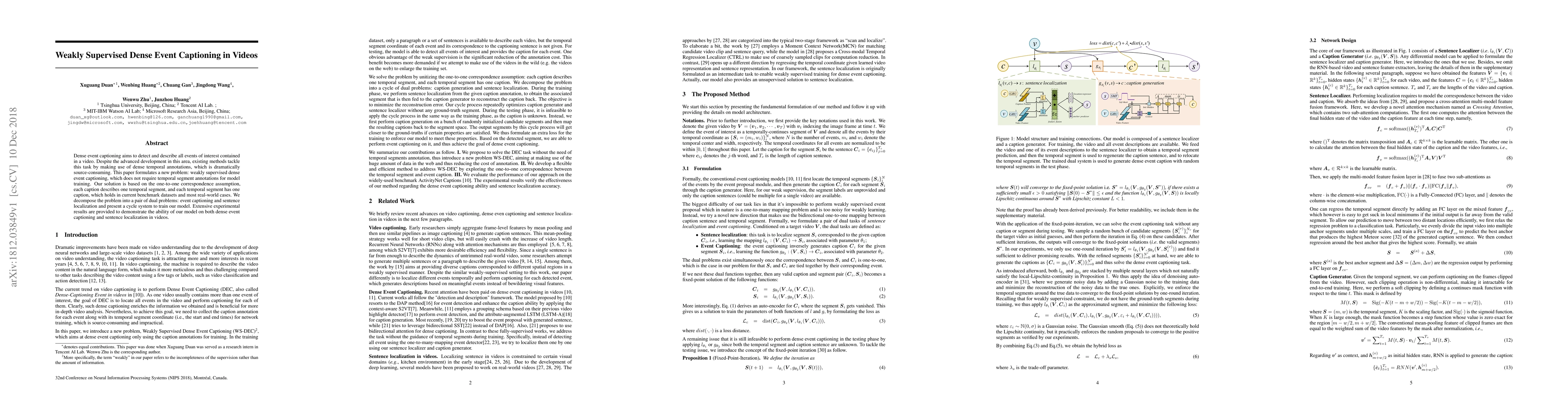 This paper introduces a weakly supervised approach for dense event captioning in videos, eliminating the need for temporal segment annotations. It leverages a one-to-one correspondence assumption between captions and segments, and employs a cycle system to train the model through dual problems of event captioning and sentence localization.
