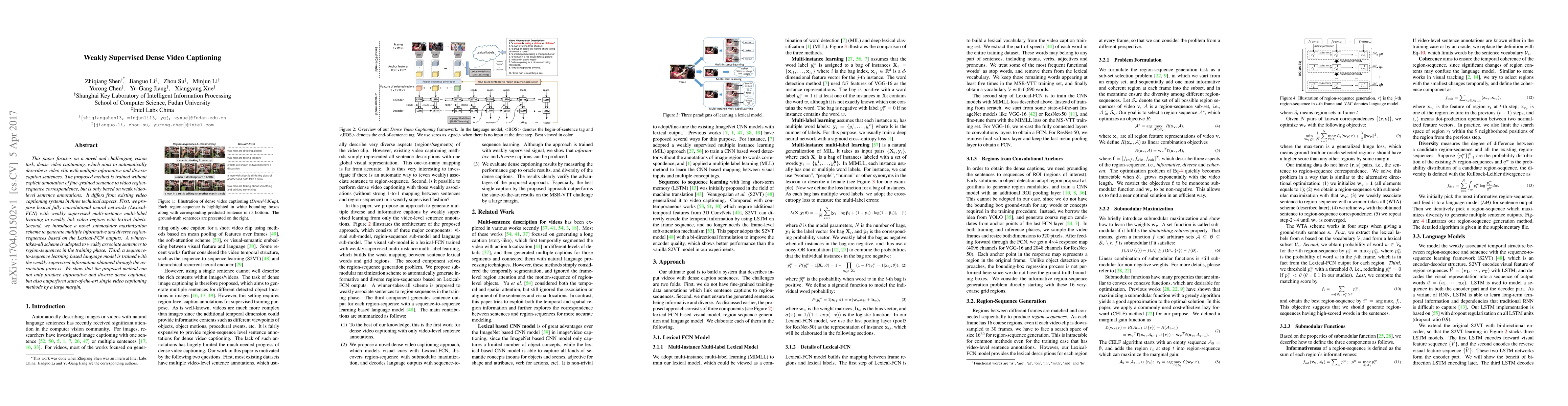 This paper presents a novel weakly supervised method for dense video captioning, utilizing lexical fully convolutional networks and submodular maximization to generate diverse captions without fine-grained annotations. The approach outperforms existing single captioning methods by leveraging weakly supervised multi-instance multi-label learning and sequence-to-sequence language modeling.