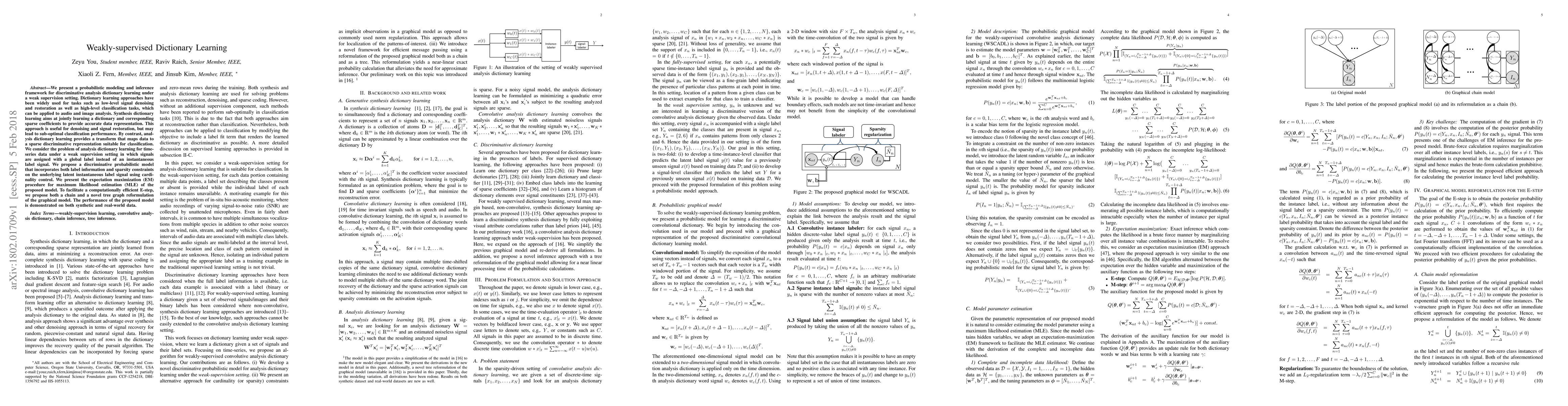 This paper introduces a probabilistic framework for discriminative analysis dictionary learning under weak supervision, focusing on time-series data classification. It proposes a model that incorporates label information and sparsity constraints, utilizing an EM procedure for maximum likelihood estimation, and demonstrates its effectiveness on both synthetic and real-world datasets.