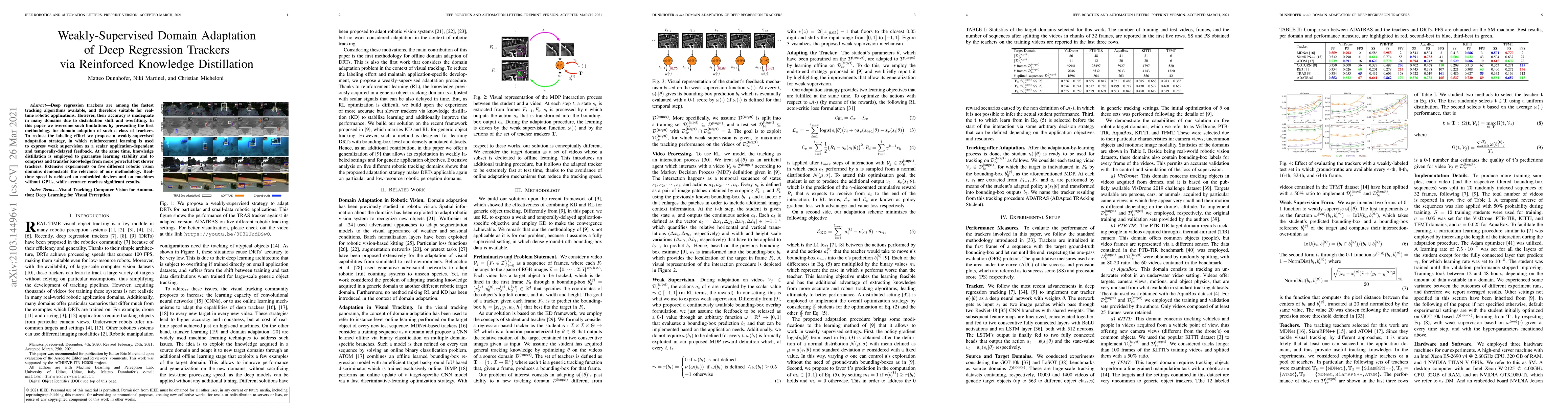 This paper proposes a weakly-supervised domain adaptation method for deep regression trackers using reinforced knowledge distillation, achieving real-time performance and improved accuracy in various robotic vision domains. The approach leverages reinforcement learning for weak supervision and knowledge distillation to enhance learning stability and transfer knowledge from slower, more accurate trackers.