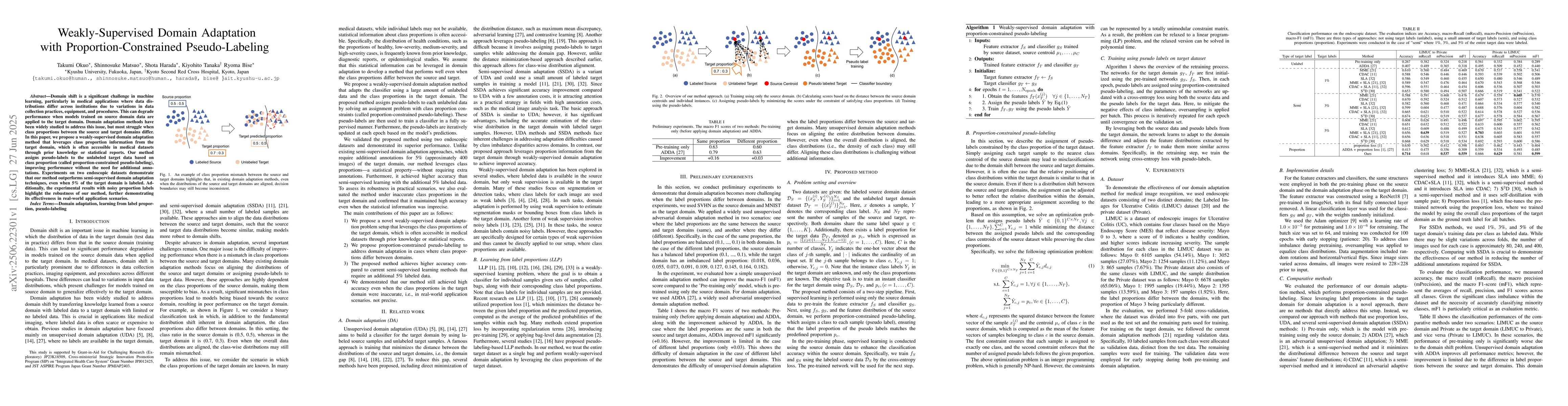 Domain shift is a significant challenge in machine learning, particularly in medical applications where data distributions differ across institutions due to variations in data collection practices, equipment, and procedures. This can degrade performance when models trained on source domain data are applied to the target domain. Domain adaptation methods have been widely studied to address this issue, but most struggle when class proportions between the source and target domains differ. In this paper, we propose a weakly-supervised domain adaptation method that leverages class proportion information from the target domain, which is often accessible in medical datasets through prior knowledge or statistical reports. Our method assigns pseudo-labels to the unlabeled target data based on class proportion (called proportion-constrained pseudo-labeling), improving performance without the need for additional annotations. Experiments on two endoscopic datasets demonstrate that our method outperforms semi-supervised domain adaptation techniques, even when 5% of the target domain is labeled. Additionally, the experimental results with noisy proportion labels highlight the robustness of our method, further demonstrating its effectiveness in real-world application scenarios.
