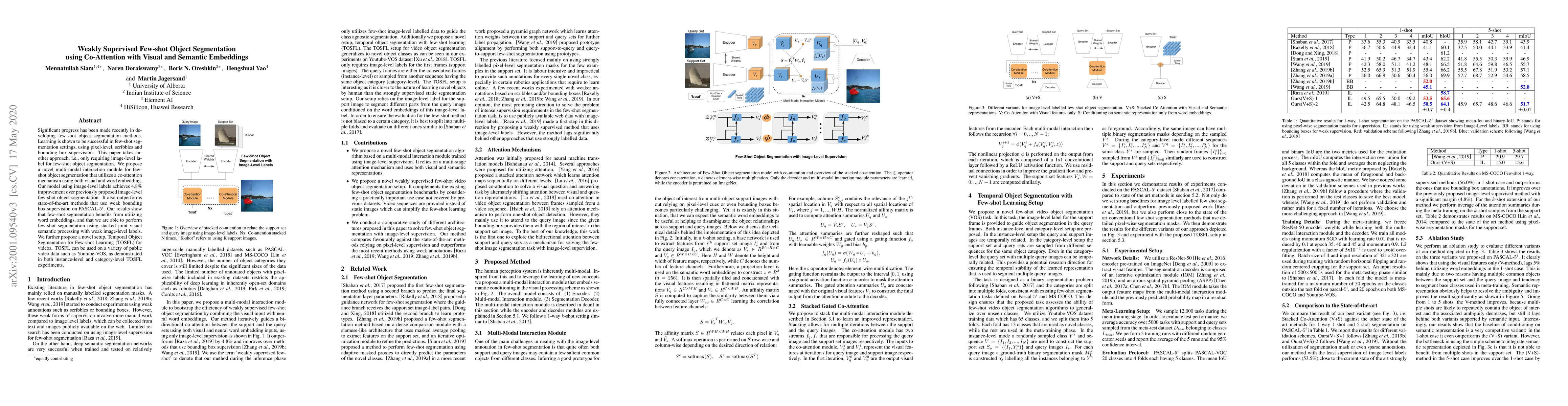 This paper introduces a co-attention mechanism combining visual and semantic embeddings for weakly supervised few-shot object segmentation, achieving a 4.8% improvement over previous methods using only image-level labels. It also presents TOSFL for temporal few-shot learning in videos, demonstrating its effectiveness on public datasets.