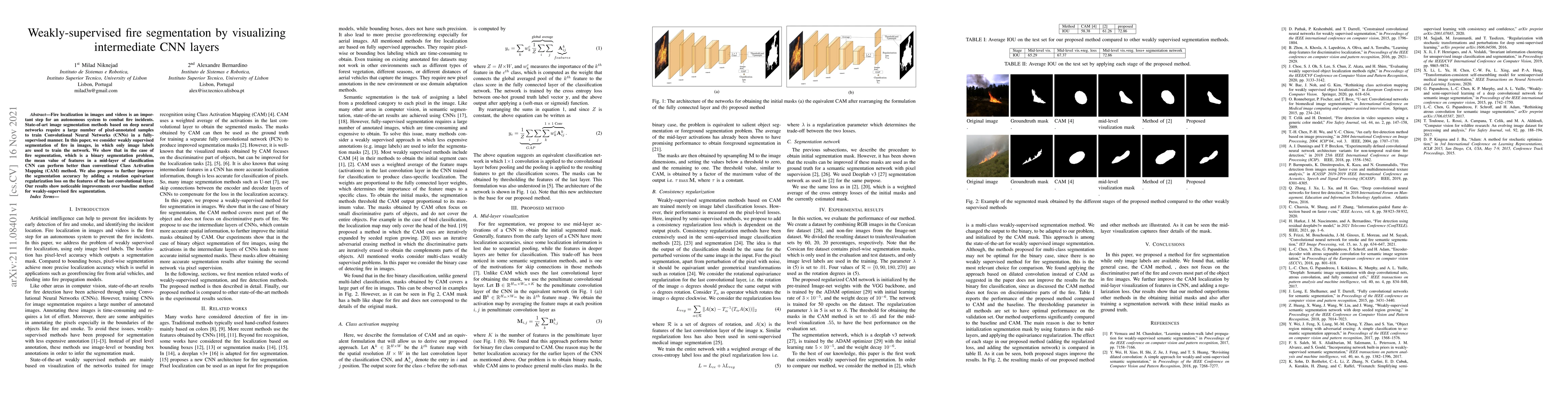 This paper proposes a weakly-supervised method for fire segmentation in images using deep CNNs, which only requires image labels, not pixel-level annotations. It demonstrates that mid-layer feature mean values outperform traditional CAM methods and introduces a rotation equivariant regularization loss to enhance segmentation accuracy.