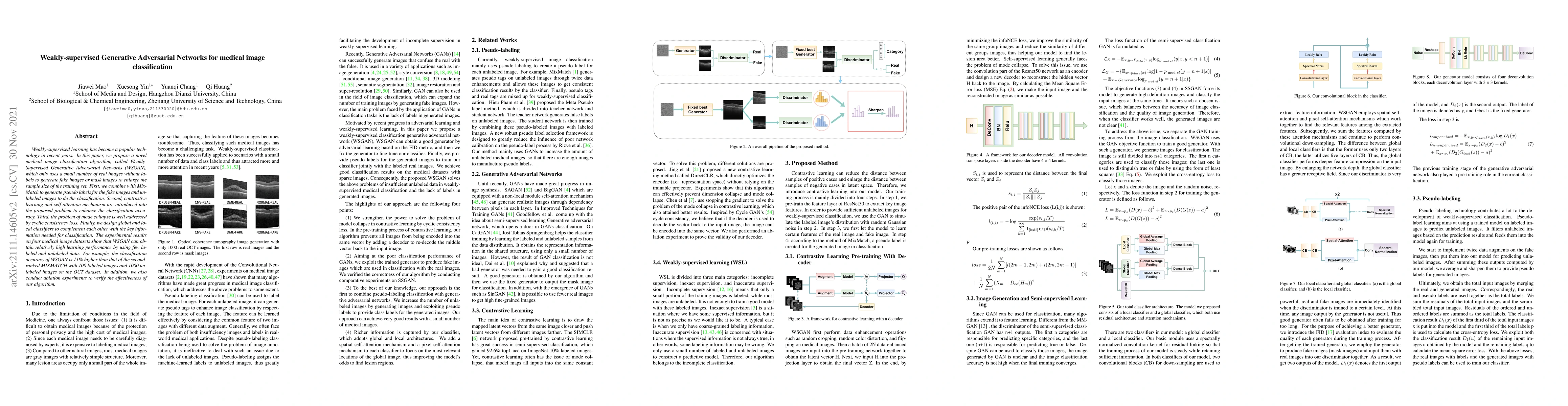 Weakly-supervised learning has become a popular technology in recent years. In this paper, we propose a novel medical image classification algorithm, called Weakly-Supervised Generative Adversarial Networks (WSGAN), which only uses a small number of real images without labels to generate fake images or mask images to enlarge the sample size of the training set. First, we combine with MixMatch to generate pseudo labels for the fake images and unlabeled images to do the classification. Second, contrastive learning and self-attention mechanism are introduced into the proposed problem to enhance the classification accuracy. Third, the problem of mode collapse is well addressed by cyclic consistency loss. Finally, we design global and local classifiers to complement each other with the key information needed for classification. The experimental results on four medical image datasets show that WSGAN can obtain relatively high learning performance by using few labeled and unlabeled data. For example, the classification accuracy of WSGAN is 11% higher than that of the second-ranked MIXMATCH with 100 labeled images and 1000 unlabeled images on the OCT dataset. In addition, we also conduct ablation experiments to verify the effectiveness of our algorithm.