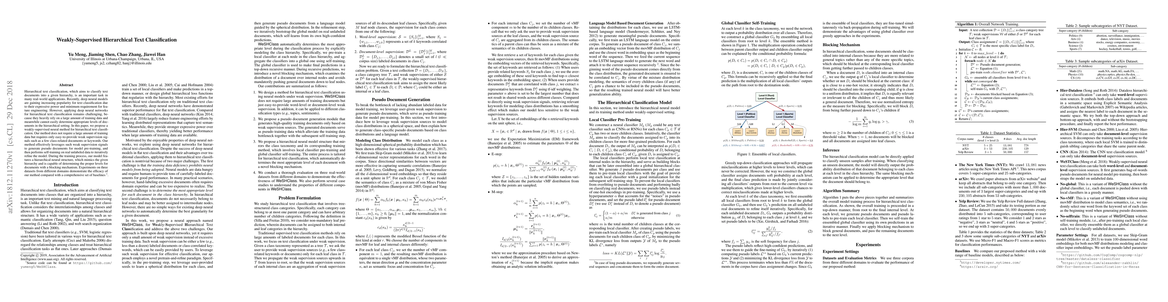 This paper proposes a weakly-supervised neural method for hierarchical text classification that requires minimal training data, using weak supervision signals like keywords. It leverages pseudo document generation and self-training to iteratively refine the model, featuring a hierarchical neural structure that determines appropriate document levels.