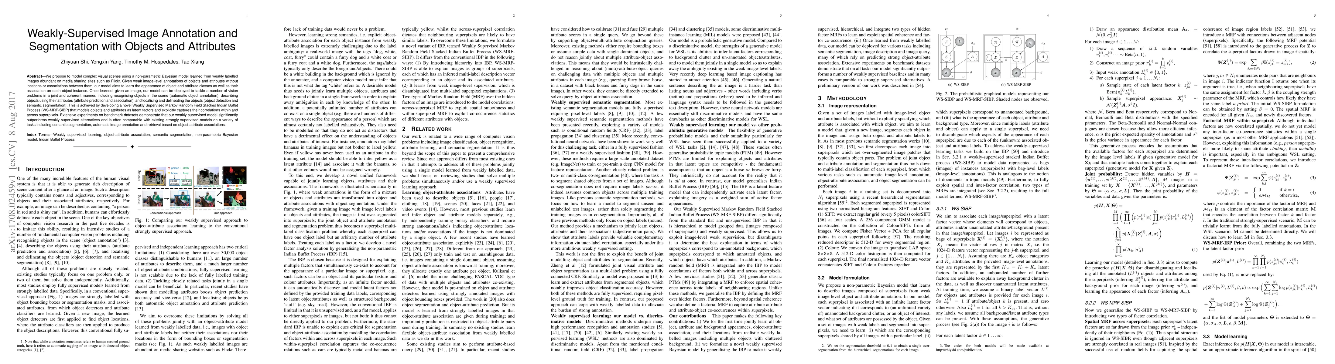 We propose to model complex visual scenes using a non-parametric Bayesian model learned from weakly labelled images abundant on media sharing sites such as Flickr. Given weak image-level annotations of objects and attributes without locations or associations between them, our model aims to learn the appearance of object and attribute classes as well as their association on each object instance. Once learned, given an image, our model can be deployed to tackle a number of vision problems in a joint and coherent manner, including recognising objects in the scene (automatic object annotation), describing objects using their attributes (attribute prediction and association), and localising and delineating the objects (object detection and semantic segmentation). This is achieved by developing a novel Weakly Supervised Markov Random Field Stacked Indian Buffet Process (WS-MRF-SIBP) that models objects and attributes as latent factors and explicitly captures their correlations within and across superpixels. Extensive experiments on benchmark datasets demonstrate that our weakly supervised model significantly outperforms weakly supervised alternatives and is often comparable with existing strongly supervised models on a variety of tasks including semantic segmentation, automatic image annotation and retrieval based on object-attribute associations.