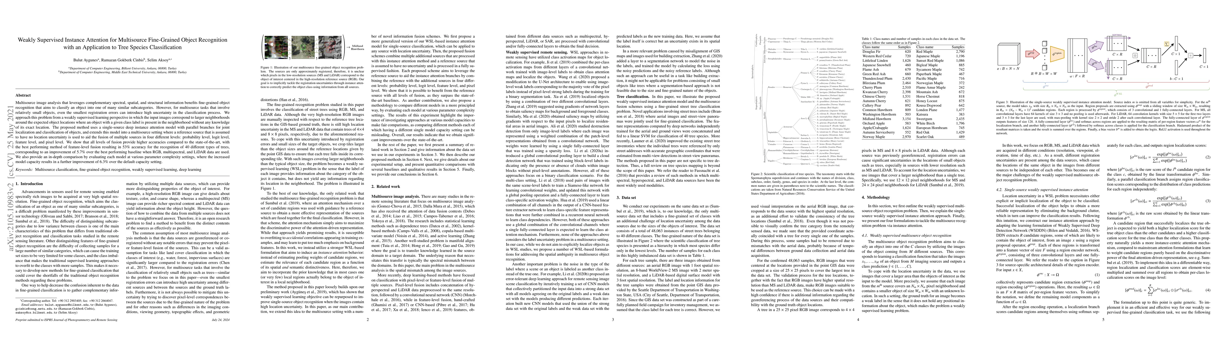 This paper presents a weakly supervised instance attention model for multisource fine-grained object recognition, specifically applied to tree species classification. The method fuses complementary spectral, spatial, and structural data at multiple levels, achieving a 53% accuracy rate for 40 tree species, outperforming the best baseline by 5.7%.