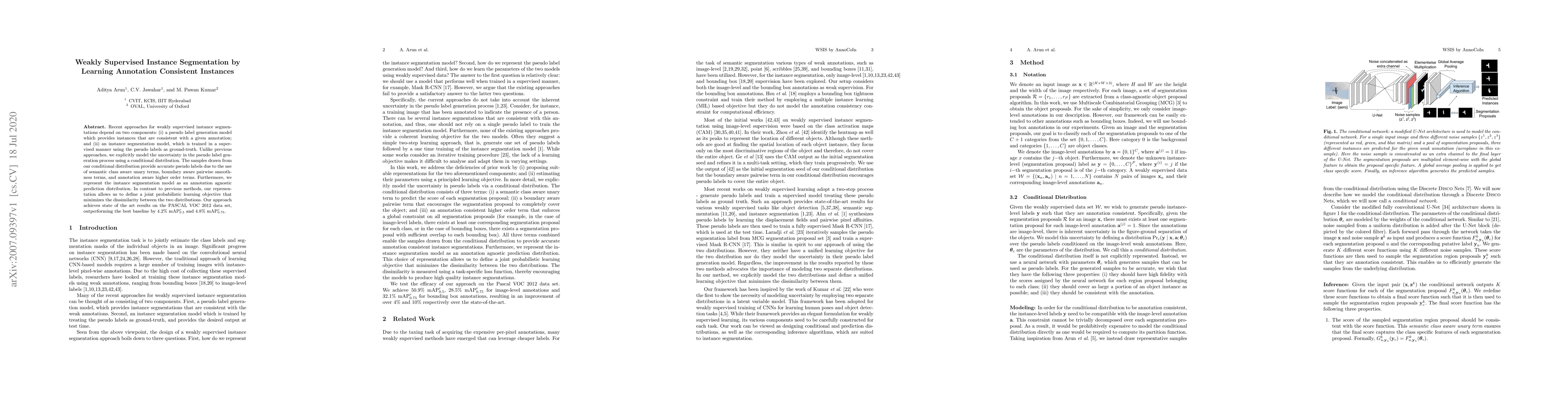 Recent approaches for weakly supervised instance segmentations depend on two components: (i) a pseudo label generation model that provides instances which are consistent with a given annotation; and (ii) an instance segmentation model, which is trained in a supervised manner using the pseudo labels as ground-truth. Unlike previous approaches, we explicitly model the uncertainty in the pseudo label generation process using a conditional distribution. The samples drawn from our conditional distribution provide accurate pseudo labels due to the use of semantic class aware unary terms, boundary aware pairwise smoothness terms, and annotation aware higher order terms. Furthermore, we represent the instance segmentation model as an annotation agnostic prediction distribution. In contrast to previous methods, our representation allows us to define a joint probabilistic learning objective that minimizes the dissimilarity between the two distributions. Our approach achieves state of the art results on the PASCAL VOC 2012 data set, outperforming the best baseline by 4.2% [email protected] and 4.8% [email protected].